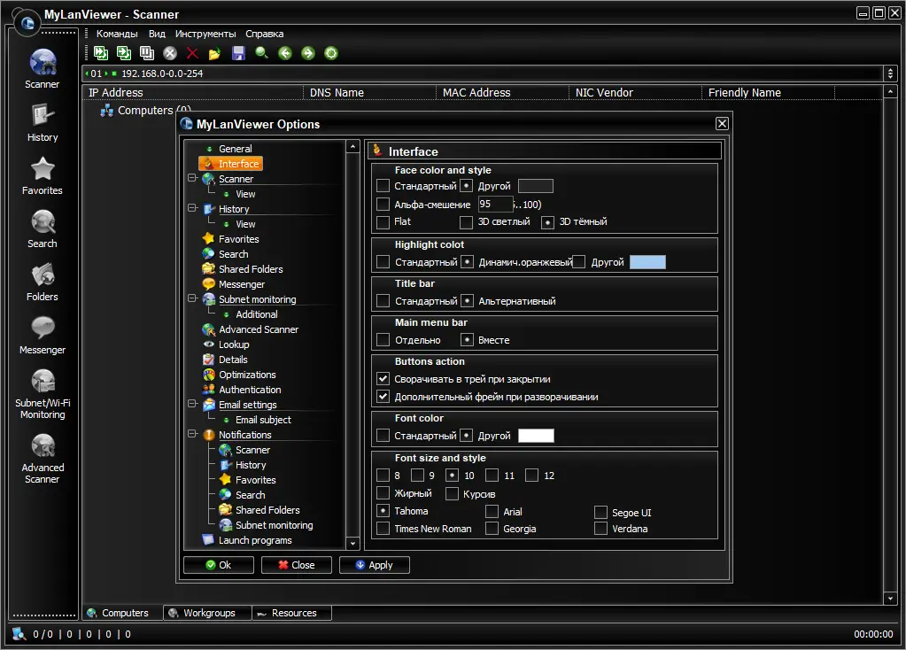 После запуска приложения начинается автоматическое сканирование локальной сети, которое можно настроить вручную через параметры. Пользователь может указать диапазон IP-адресов, выбрать используемые протоколы и задать интервал повторного поиска. Найденные устройства отображаются в виде списка, где можно быстро перейти к общим папкам, проверить активность сессий или закрыть подключения. Дополнительно доступна функция поиска файлов по сети с фильтрацией по имени, размеру и типу.