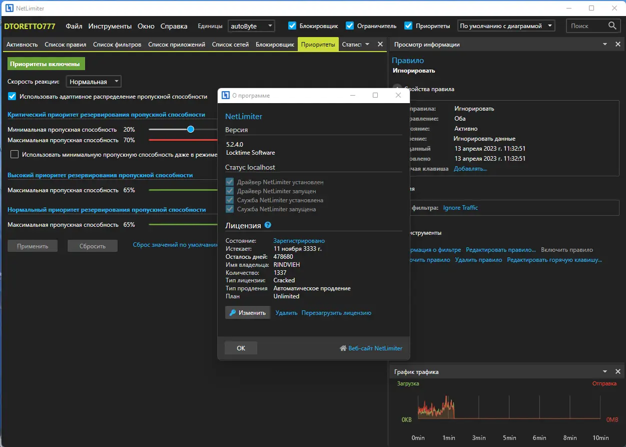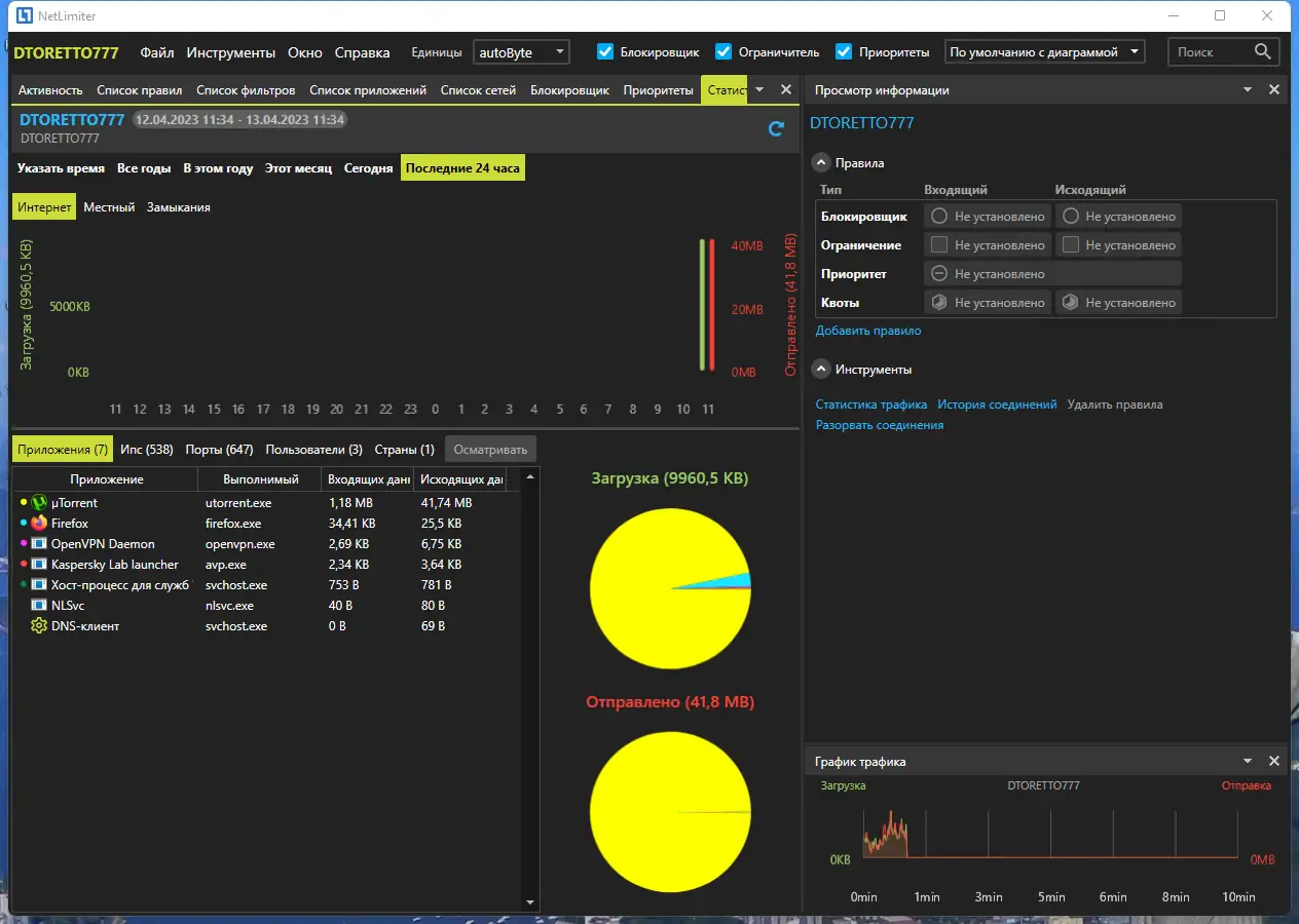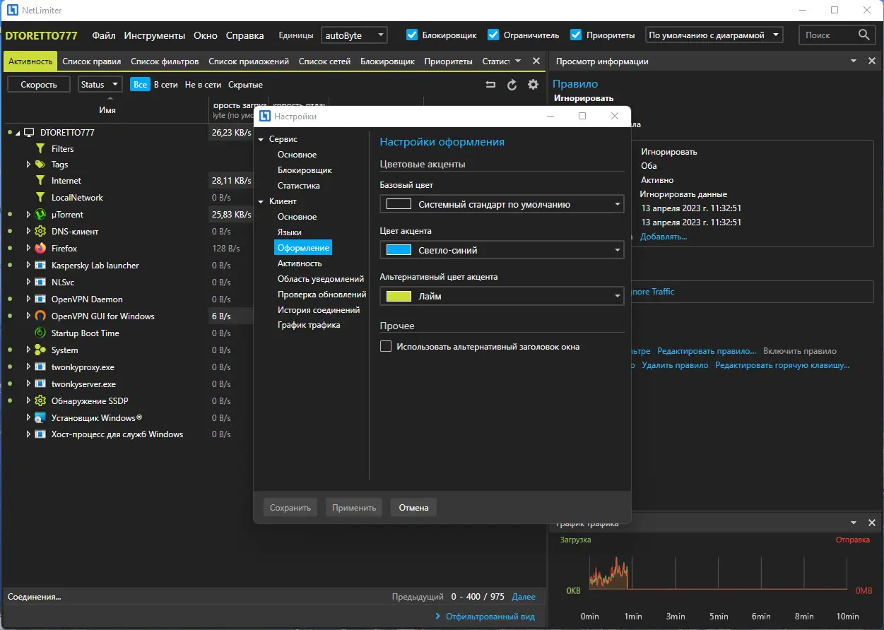 NetLimiter предлагает широкий функционал, выходящий за рамки стандартных средств контроля трафика. Интерфейс интуитивно понятен, а визуализация данных в виде графиков и диаграмм позволяет быстро оценить нагрузку на сеть. Поддержка долгосрочной статистики помогает анализировать использование интернета за день, неделю или месяц. Программное обеспечение подходит как для домашних пользователей, так и для системных администраторов.