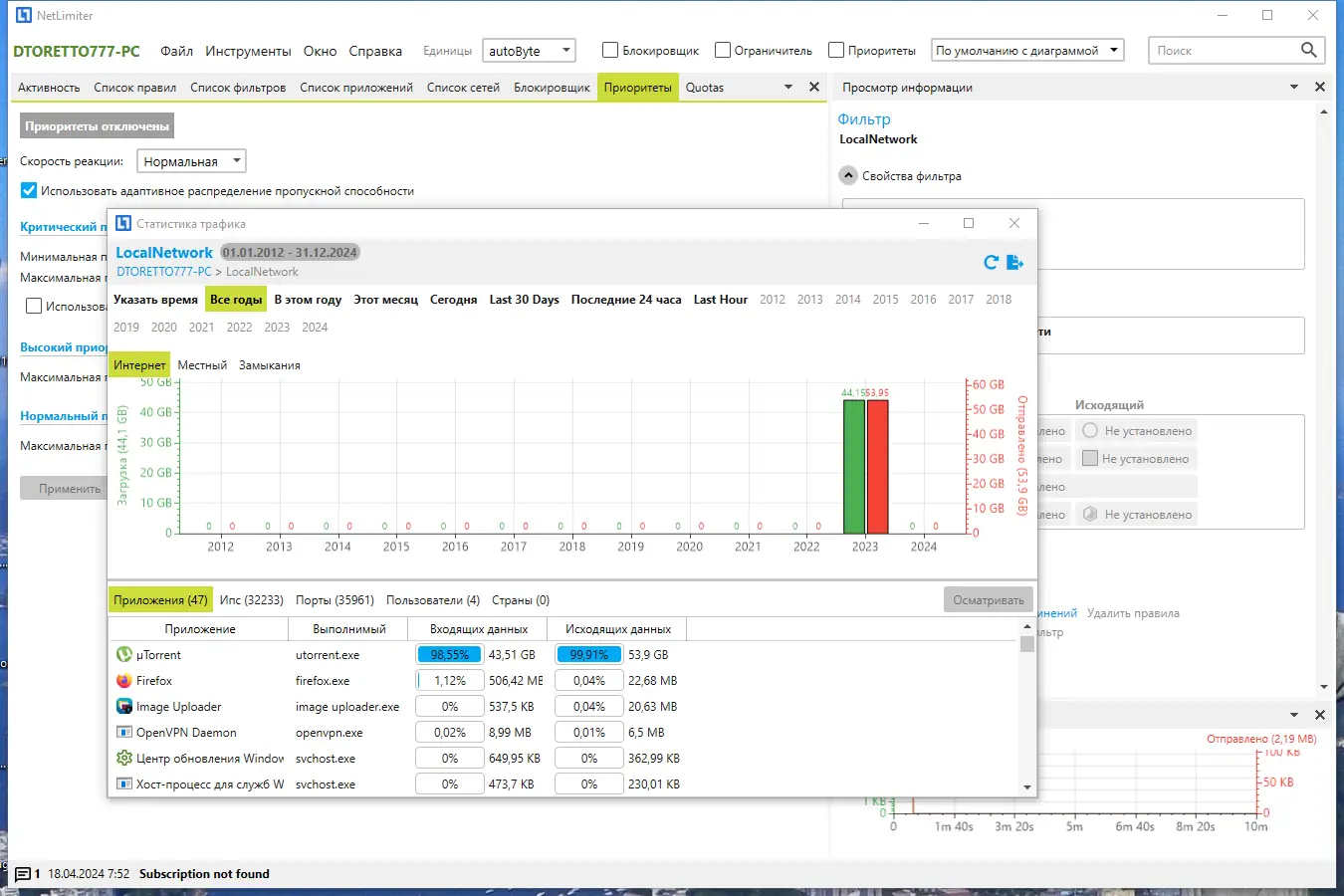 NetLimiter — это мощное программное обеспечение для детального контроля сетевого трафика на персональном компьютере, позволяющее отслеживать и управлять подключением каждого приложения к интернету. Программа предоставляет пользователям инструменты для ограничения скорости загрузки и отдачи, анализа активности сетевых соединений и настройки приоритетов. Благодаря широким возможностям мониторинга и управления, это решение особенно полезно в условиях ограниченного канала связи или при необходимости оптимизации использования пропускной способности.