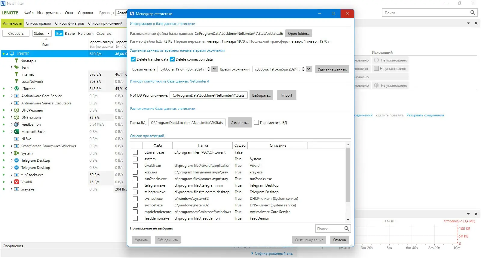 - Мониторинг активности всех приложений в реальном времени с отображением скорости передачи данных.