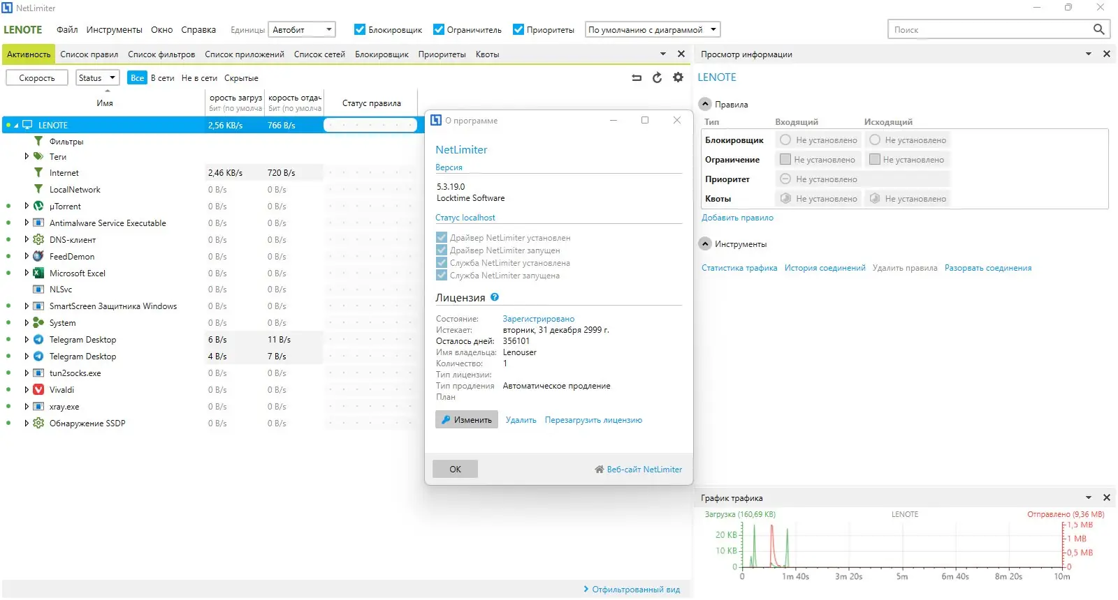 NetLimiter — это инструмент для детального контроля сетевого трафика на персональном компьютере, позволяющий отслеживать и управлять подключением каждого приложения к интернету. Программа предоставляет возможность ограничивать скорость загрузки и отдачи данных, а также вести учёт передаваемой информации за определённые периоды времени. Благодаря гибким настройкам фильтрации и приоритизации соединений, пользователь может эффективно распределять канал связи между различными задачами.