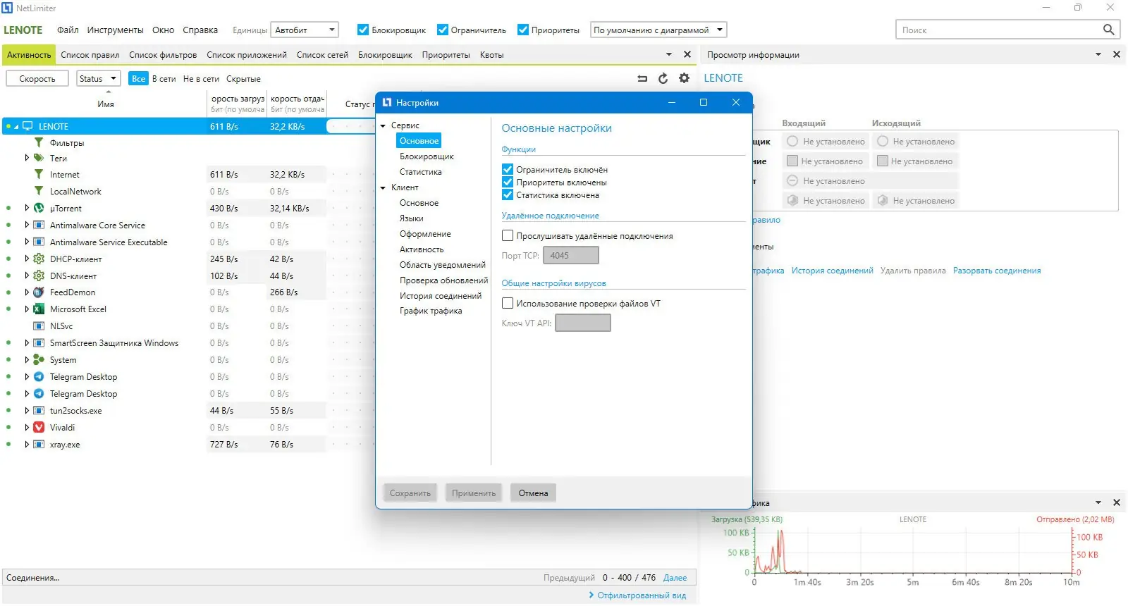 - Подробная статистика и визуализация нагрузки на сеть в виде графиков.