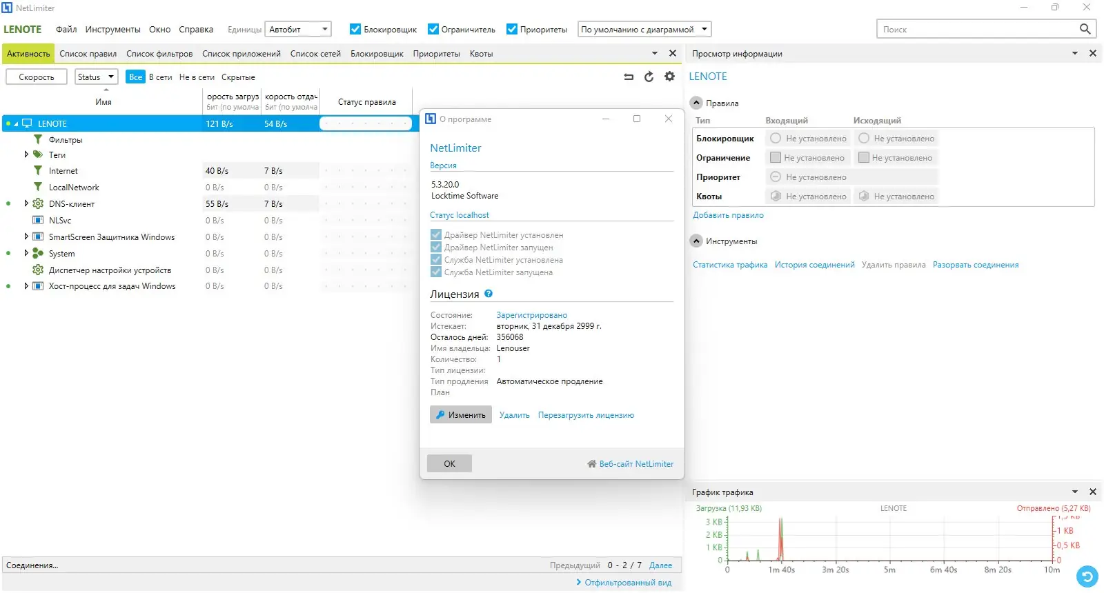 NetLimiter — это мощный инструмент для контроля сетевого трафика, позволяющий отслеживать и управлять активностью приложений в сети. Программа предоставляет детальную аналитику передачи данных, настраивает ограничения по скорости и приоритизирует соединения. Это незаменимое решение для пользователей, стремящихся оптимизировать использование интернет-ресурсов на своём компьютере. Подходит как для домашнего, так и для корпоративного применения.