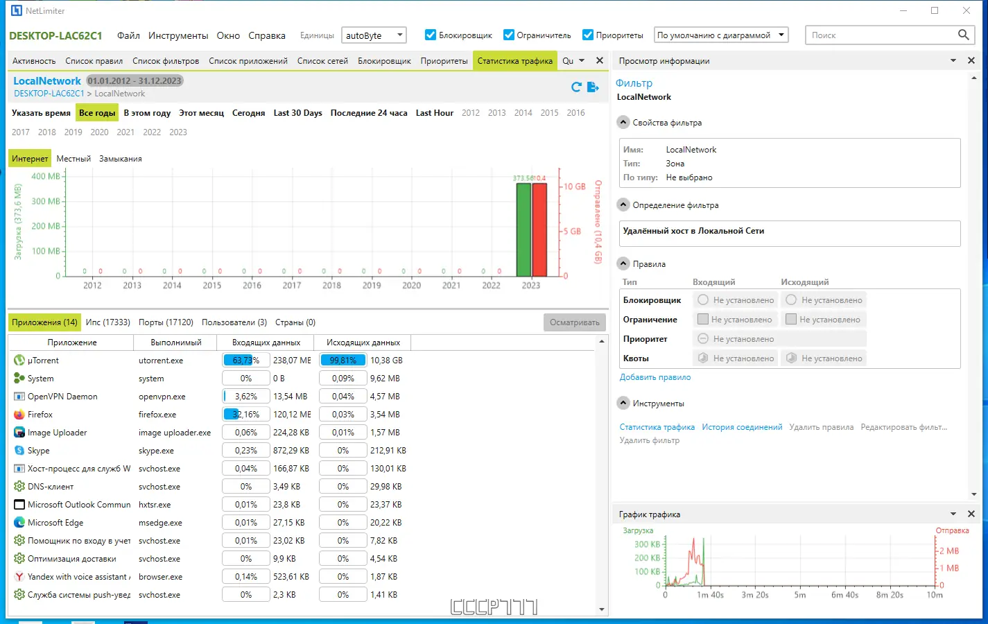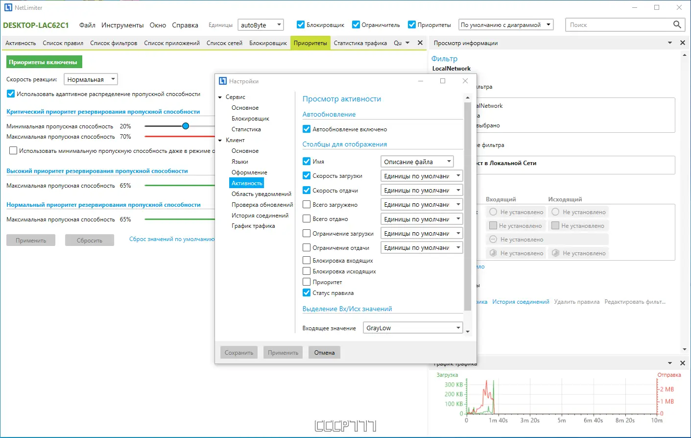Программа позволяет не только следить за сетевой активностью, но и активно управлять ею, обеспечивая стабильную работу в условиях ограниченного интернет-канала.