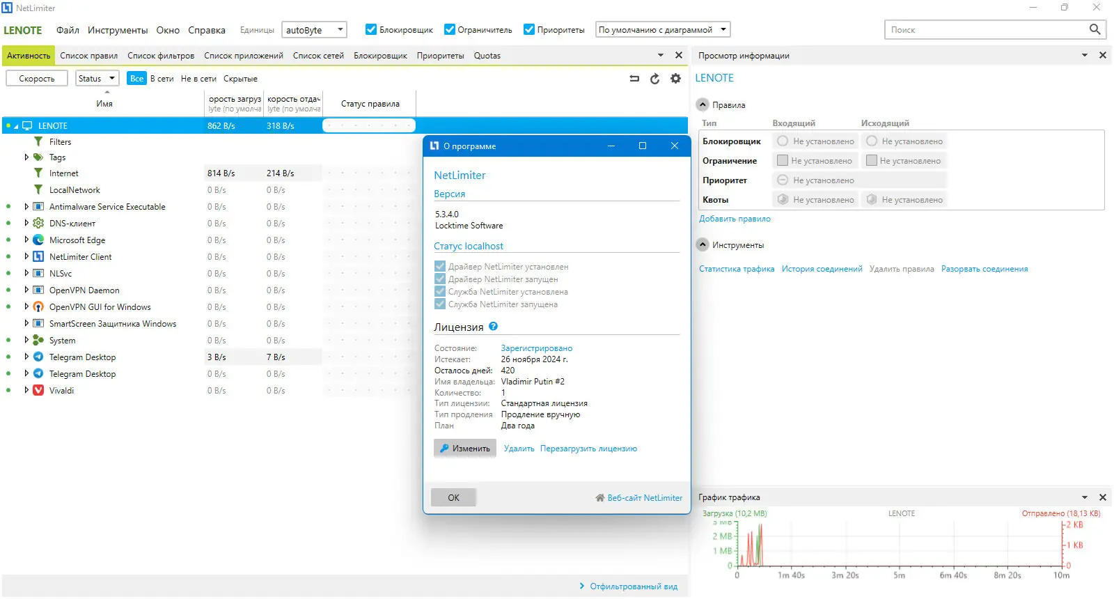 NetLimiter — это инструмент для детального контроля сетевого трафика, позволяющий отслеживать активность приложений в интернете и управлять скоростью их соединений. Программа предоставляет возможность ограничивать или приоритизировать передачу данных, а также собирать статистику по каждому подключению. что это за программа — становится понятно уже при первом запуске: это мощный монитор и регулятор сетевого взаимодействия.