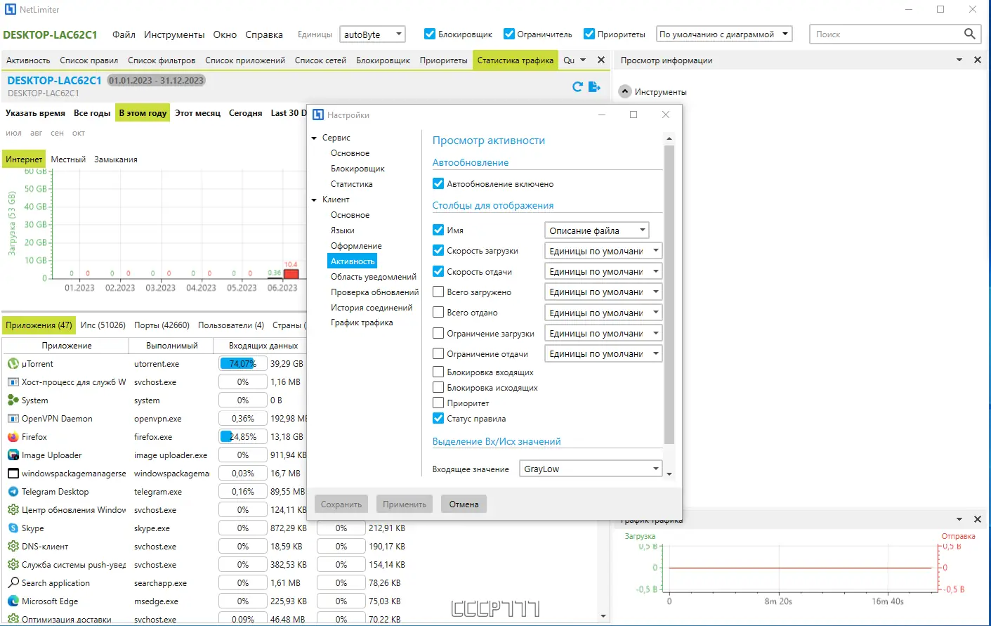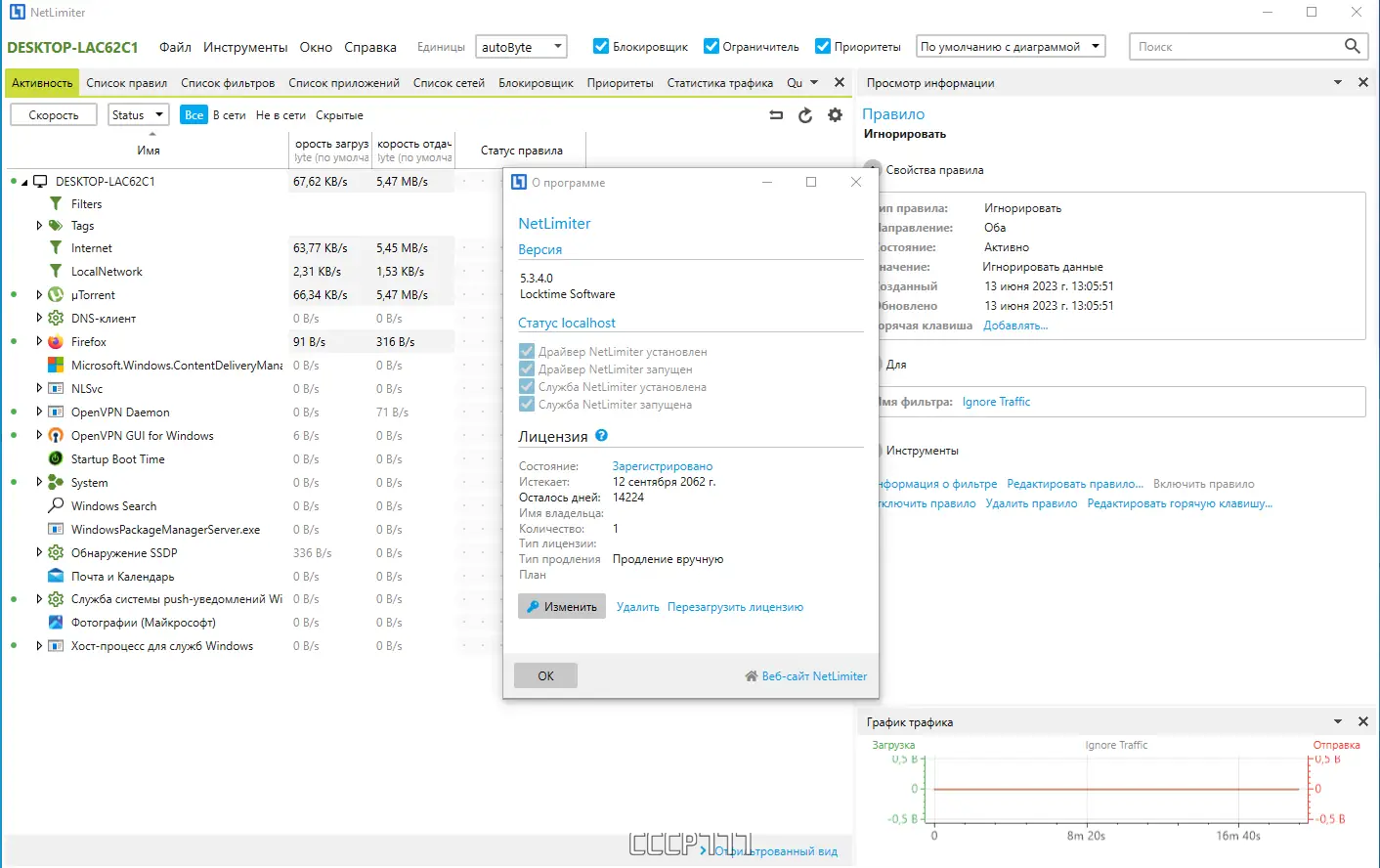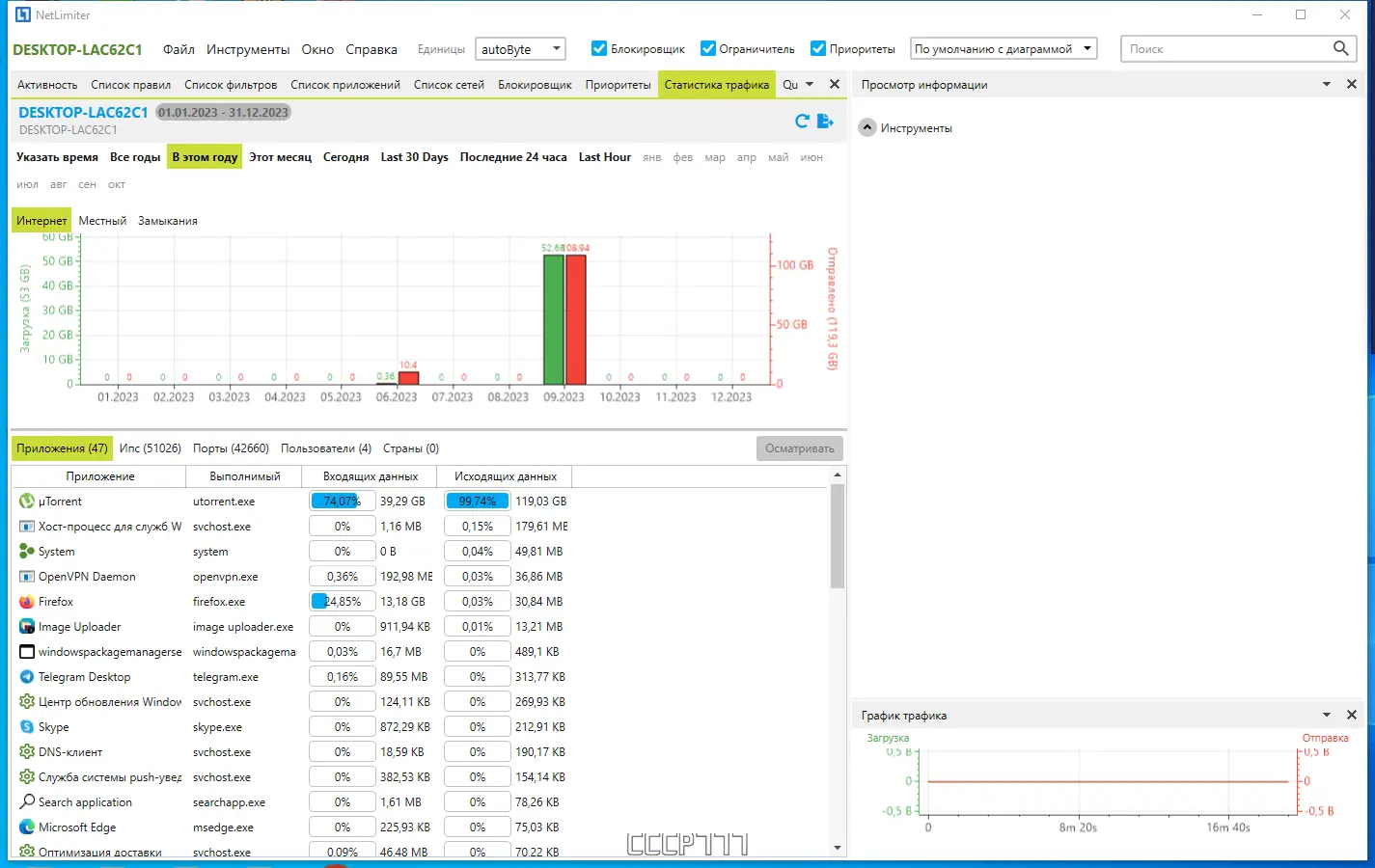 Программа NetLimiter предназначена для мониторинга и управления сетевым трафиком в реальном времени. Каждое приложение, использующее интернет, отображается отдельно, с детализацией по входящему и исходящему трафику. Это позволяет точно определить, какой процесс потребляет наибольшее количество данных, и при необходимости ограничить его активность.