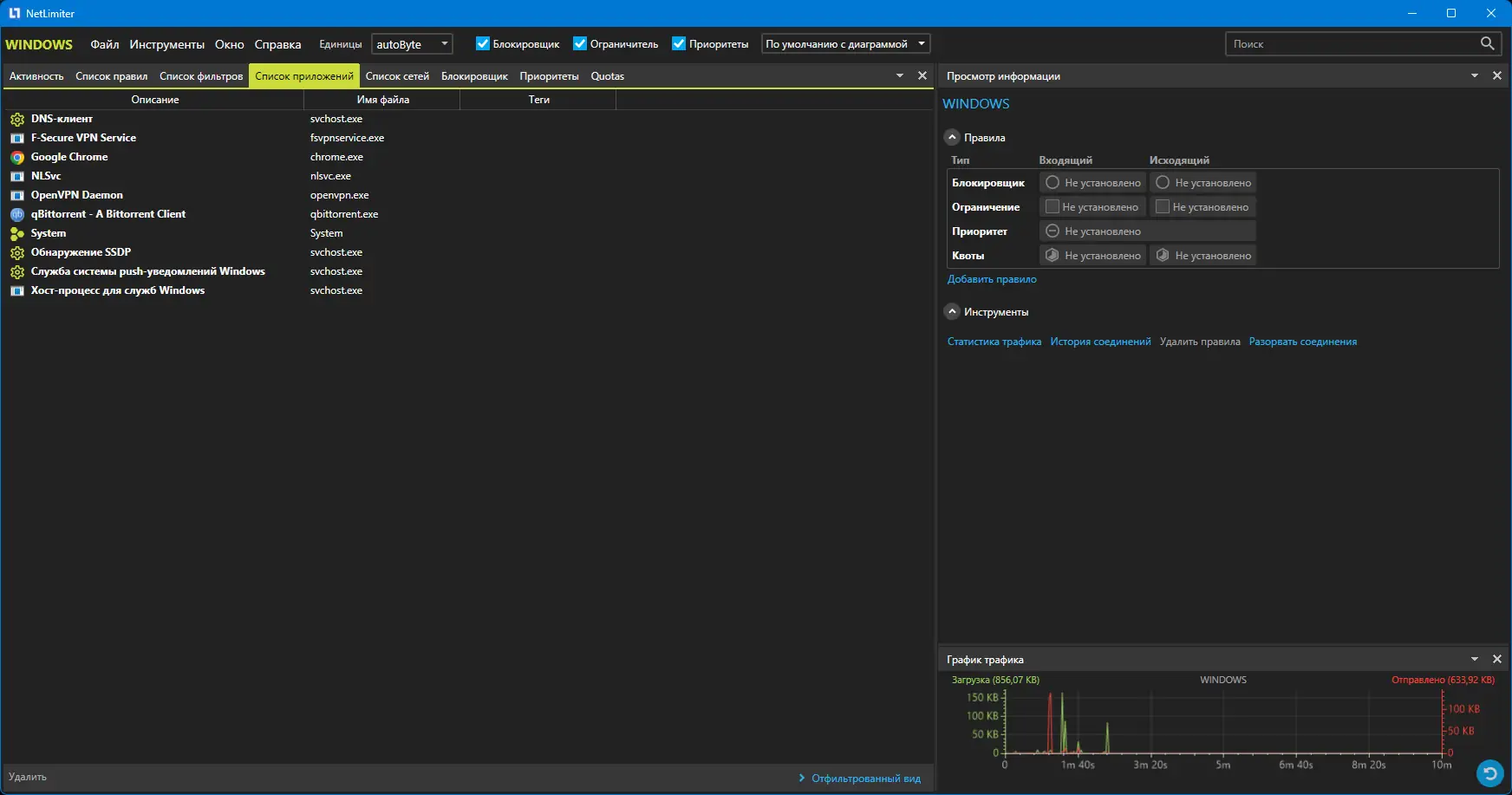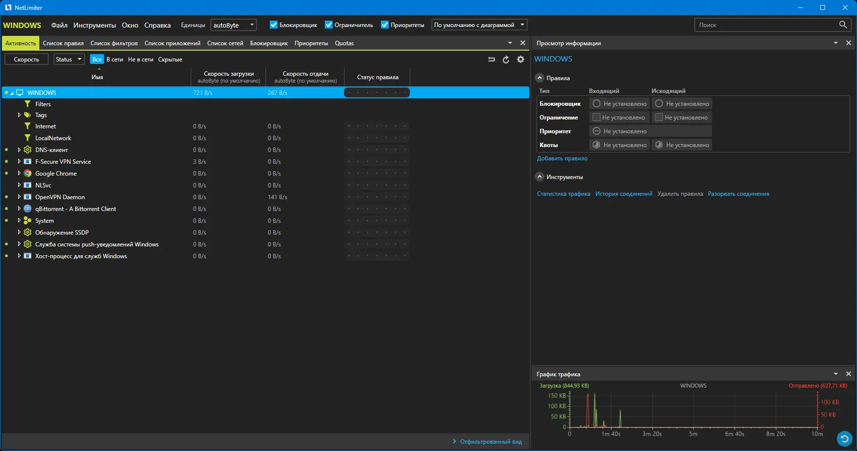 - Мониторинг активности приложений в реальном времени с отображением скорости передачи данных