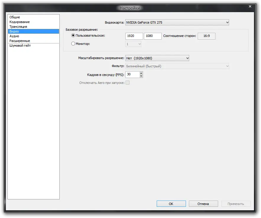 - Гибкие настройки выходного потока: разрешение, битрейт, частота кадров и пр.