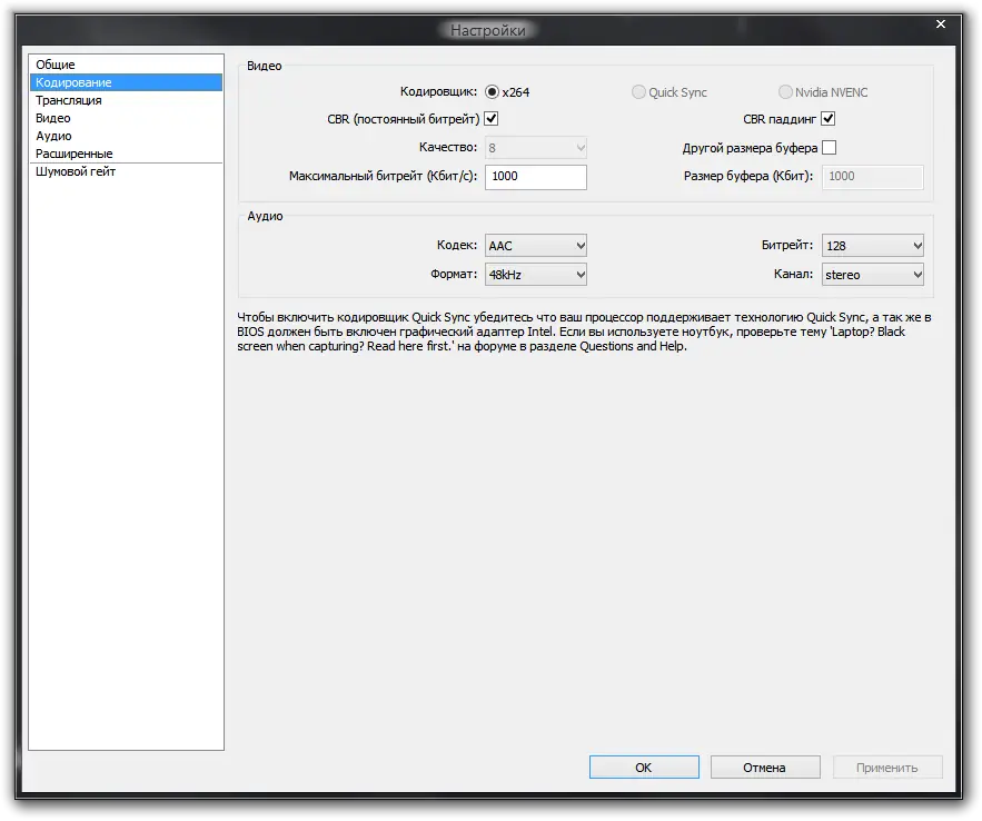- Возможность кодирования через GPU с использованием технологий NVENC и QuickSync