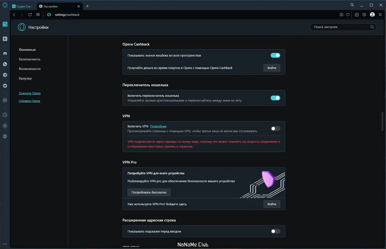 - Встроенный криптокошелёк позволяет управлять цифровыми активами без необходимости установки дополнительных расширений.