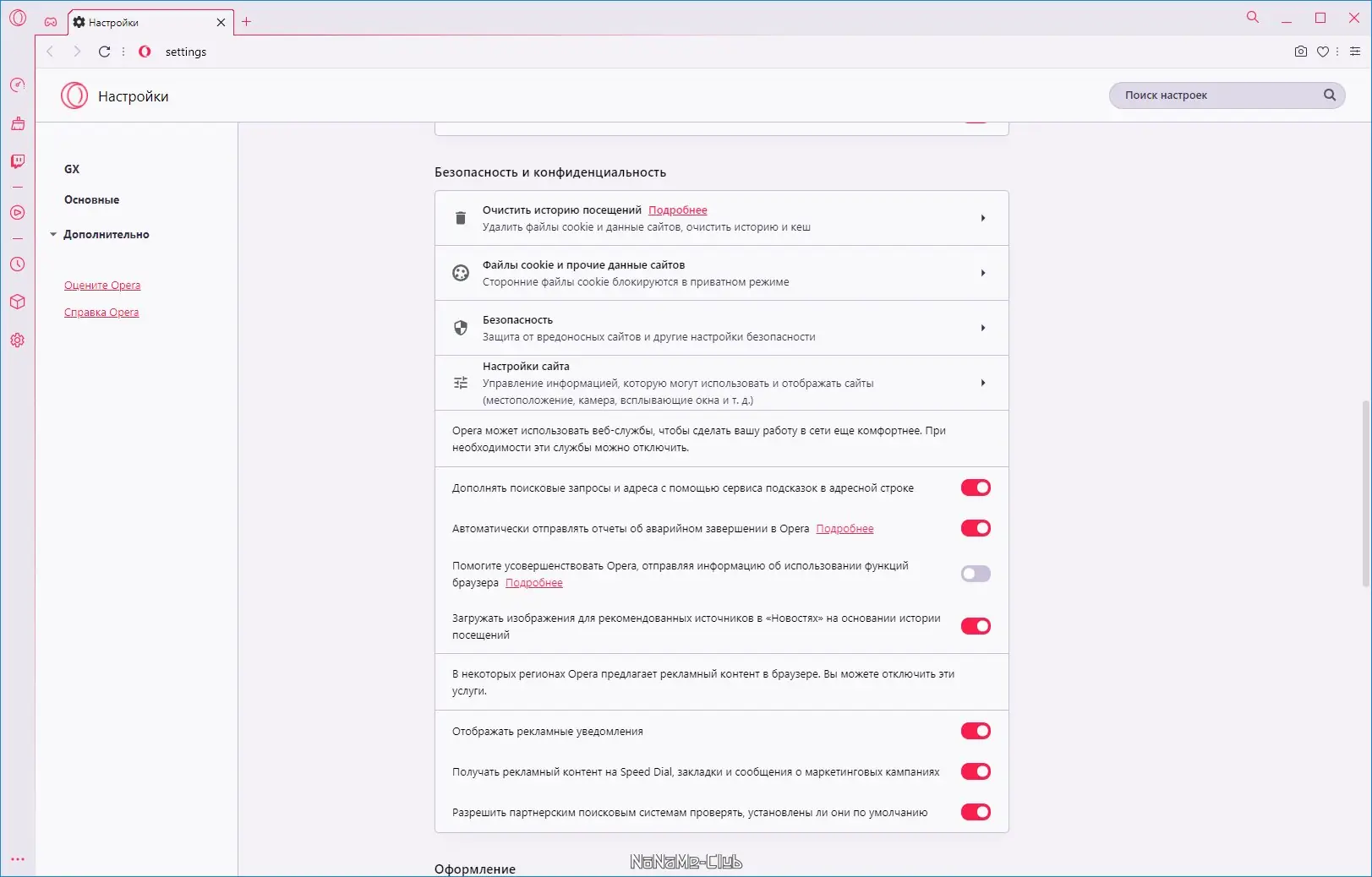- Встроенные звуковые эффекты GX Sound, добавляющие атмосферу при работе с браузером