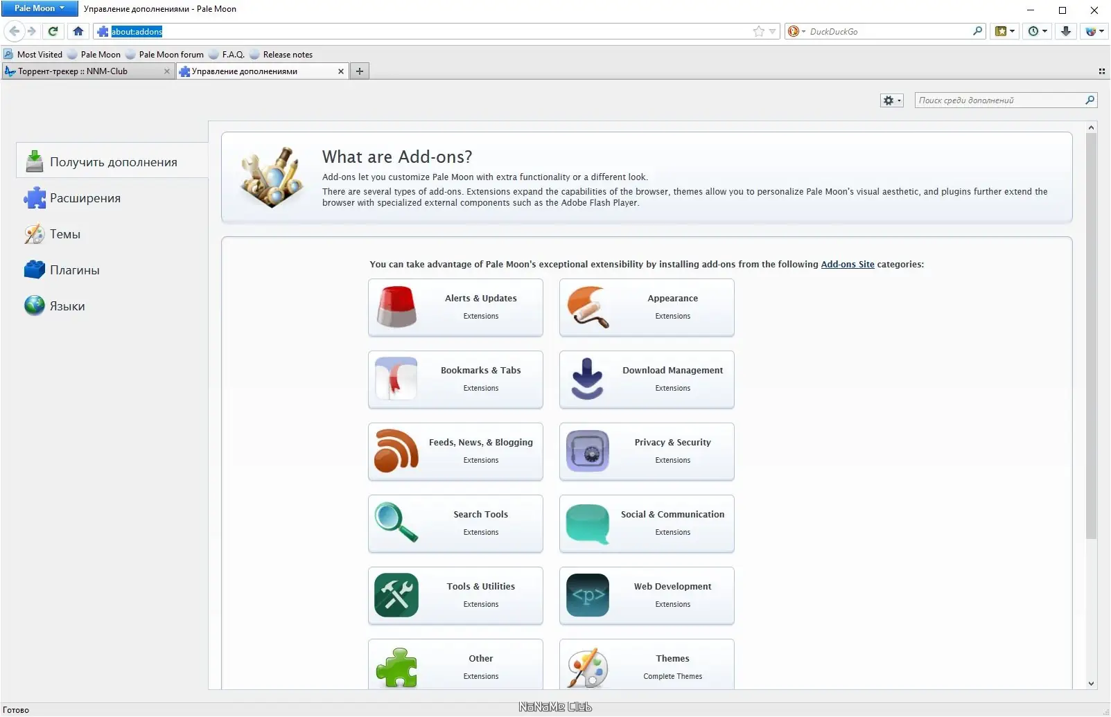 - Программа совместима с множеством расширений, созданных для Firefox, а также имеет собственные темы и аддоны, доступные через внутренний каталог.