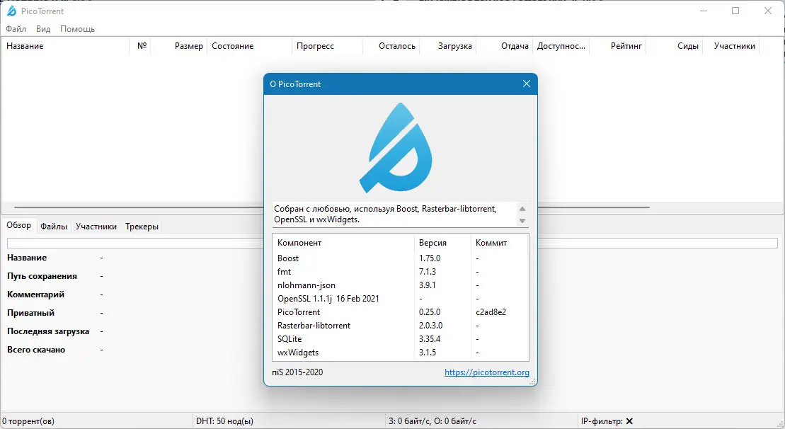 PicoTorrent доступен для бесплатного скачивания в стабильной и портативной версии. Портативная сборка не требует установки и может работать с флеш-накопителя, что удобно для использования на разных компьютерах. Для корректной работы без установки Visual C++ необходимо добавить в папку с программой три системных файла: msvcp140.dll, msvcr120.dll и vcruntime140.dll.