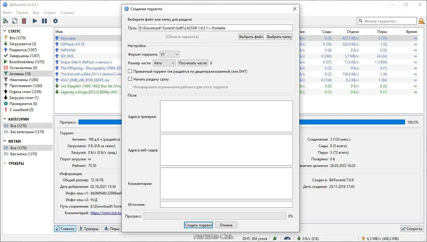 - Возможность создания собственных торрент-файлов через встроенное меню «Инструменты»