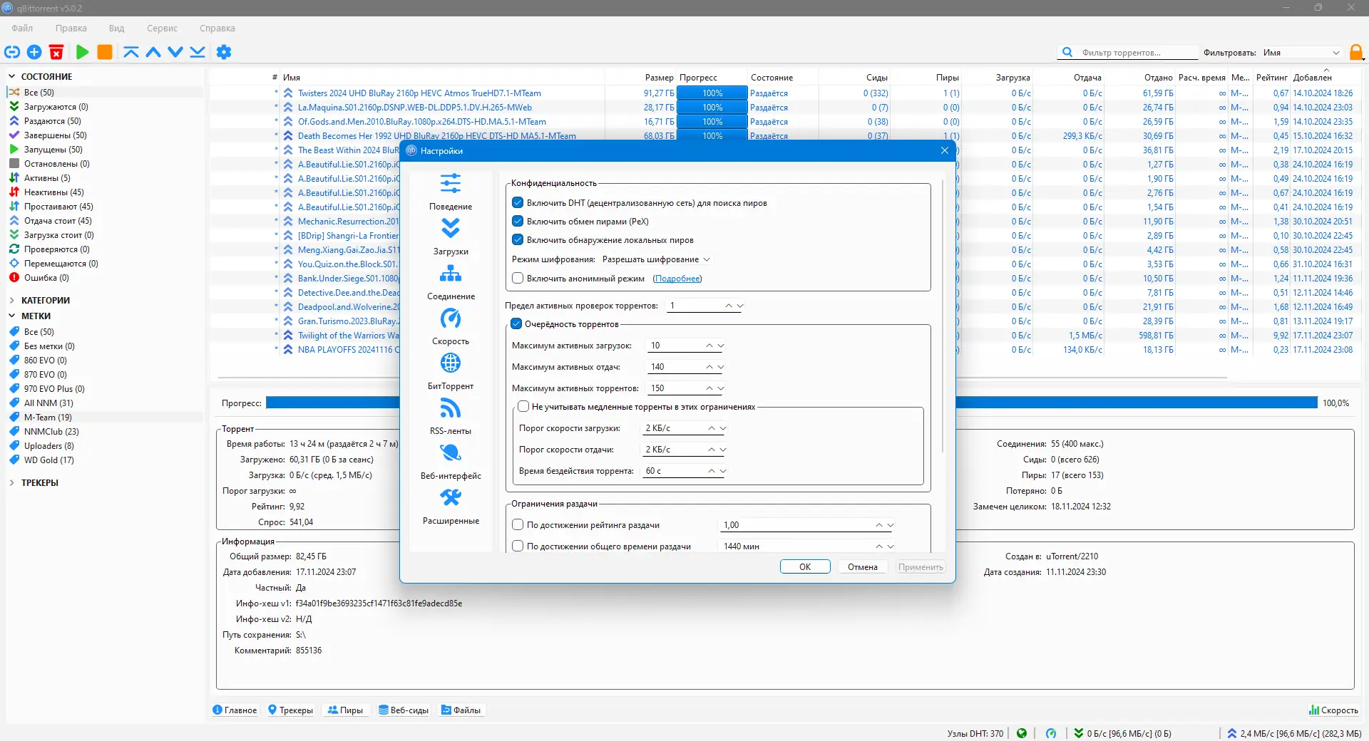 - Поддержка множества технологий, включая DHT, PeX, LPD, Web seed и magnet-ссылки