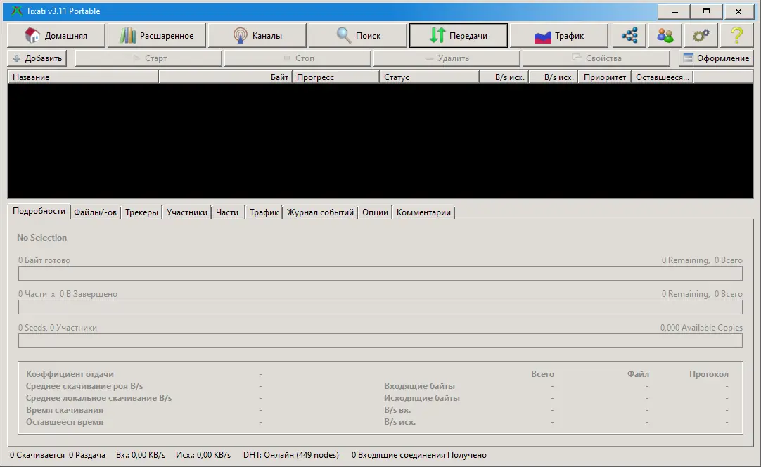 После установки Tixati интерфейс откроется с поддержкой базового набора инструментов для добавления торрентов через файл или ссылку. Все активные раздачи отображаются в виде таблицы с детальной информацией: скорость, количество пиров, статус завершения. Для управления процессом доступны опции приостановки, возобновления, настройки приоритетов файлов и ограничения скорости.