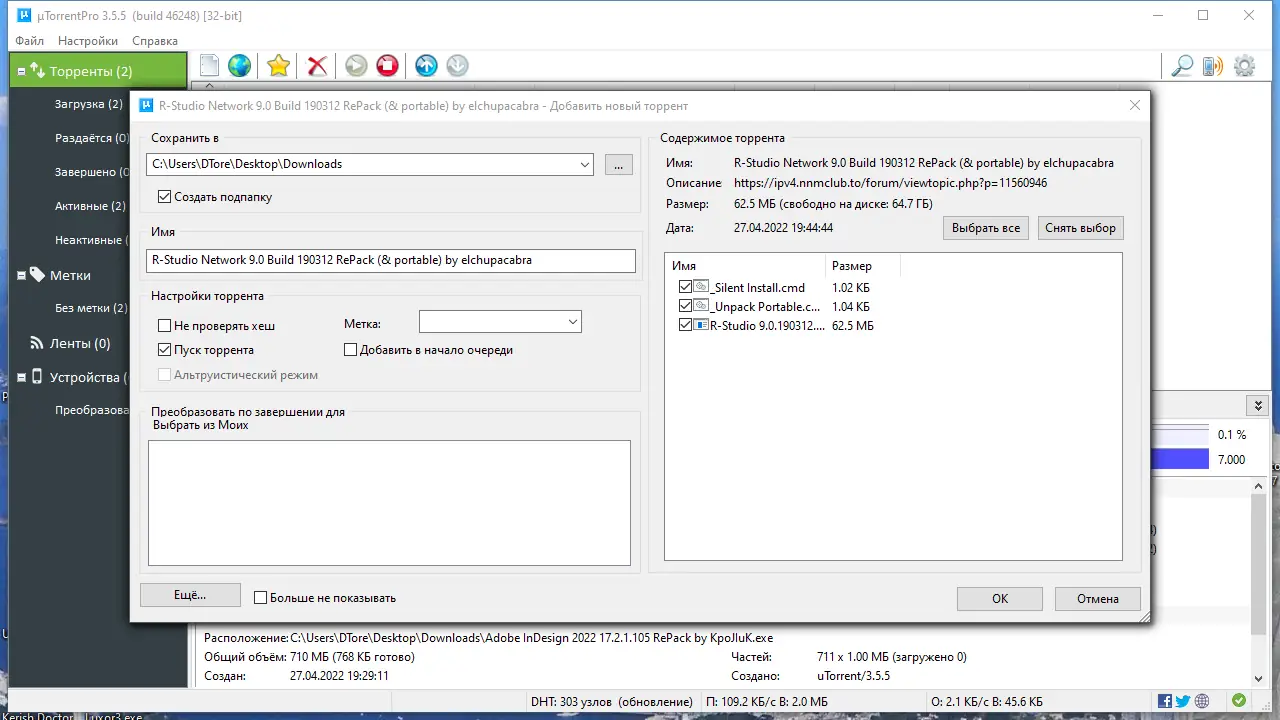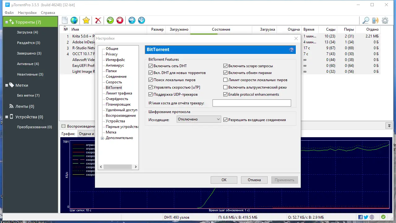 - Интеграция с DHT, что позволяет скачивать раздачи без привязки к трекерам