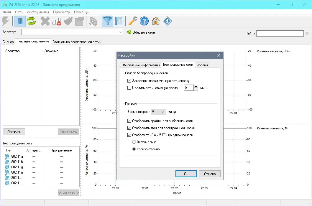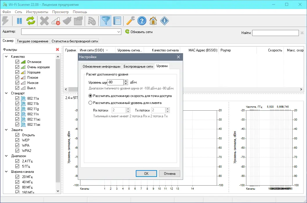 Запуск приложения не требует сложной настройки — после старта автоматически начинается сканирование доступных сетей. Пользователь видит таблицу с перечислением всех обнаруженных точек доступа, где для каждой указаны имя, частота, уровень сигнала и тип безопасности. Графики изменения сигнала в реальном времени позволяют отслеживать стабильность соединения при перемещении по помещению.