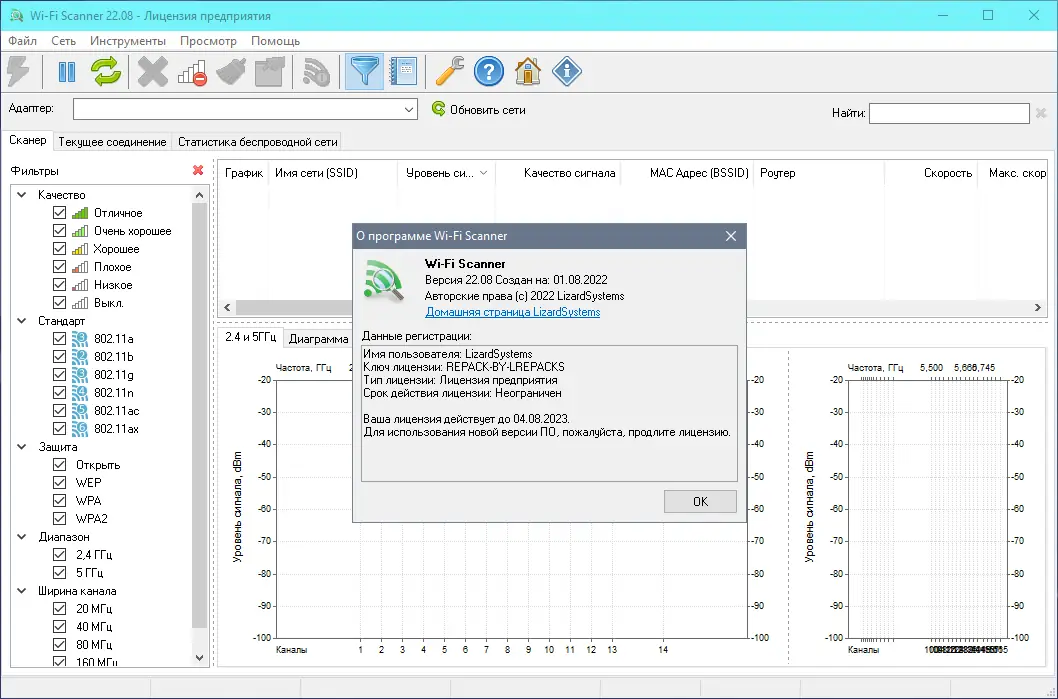 Wi-Fi Scanner — это инструмент для анализа и диагностики беспроводных сетей, позволяющий находить доступные точки доступа, оценивать уровень сигнала, каналы передачи и параметры безопасности. Программа отображает детальную информацию о каждой обнаруженной сети, включая SSID, MAC-адрес, частоту, ширину канала и поддерживаемые стандарты шифрования. Подходит как для домашнего использования, так и для профессиональной настройки корпоративных сетей.