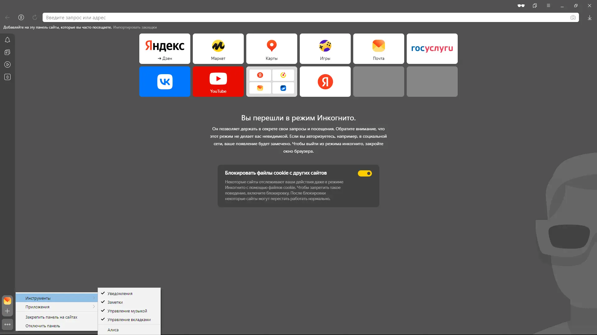 Использование Яндекс.Браузера не требует специальных навыков и интуитивно понятно с первых минут. После запуска программа предлагает перенести закладки, пароли и настройки из другого браузера, что упрощает переход. Умная строка позволяет быстро искать информацию, открывать сайты и даже выполнять команды голосом через Алису. Боковая панель предоставляет доступ к музыке, заметкам, истории и сервисам Яндекса, минимизируя необходимость переключения между вкладками.