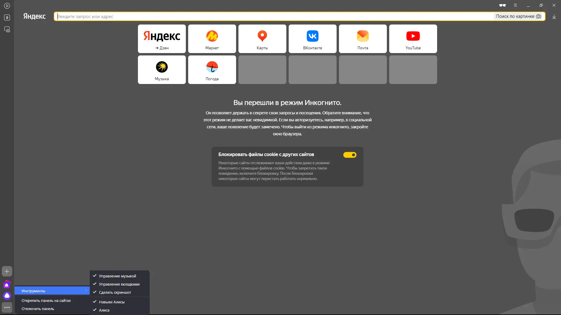 После установки браузер автоматически предложит импортировать закладки, пароли и настройки из другого обозревателя. Умная строка в верхней части окна объединяет поисковую систему и адресную строку, позволяя быстро находить нужную информацию. Для активации перевода видео достаточно открыть ролик на YouTube и включить функцию в боковой панели. Боковая панель также даёт доступ к Алисе, музыке, заметкам и мессенджеру. Экспорт паролей в файл возможен через настройки безопасности, что удобно при смене устройства. Группы вкладок помогают организовать множество открытых страниц по темам.