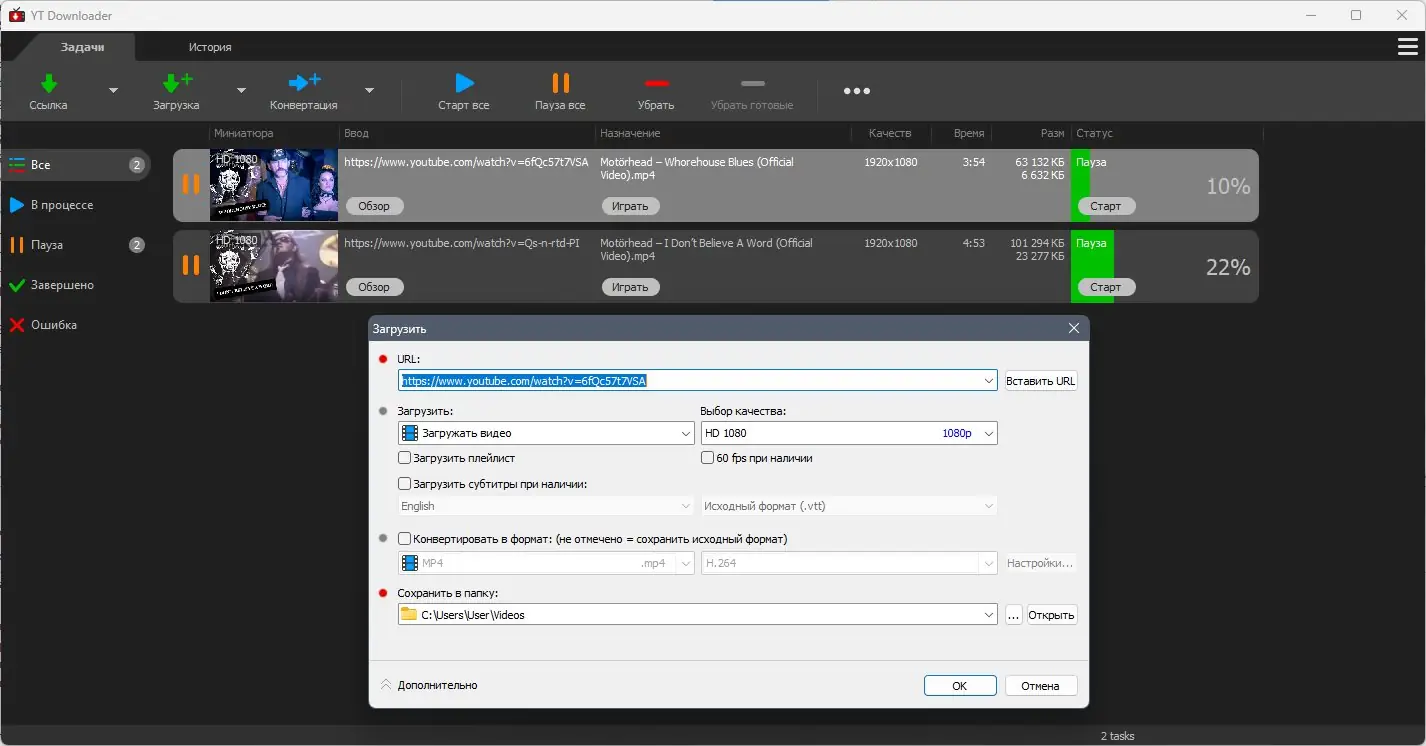 - Функция скачивания целых плейлистов с YouTube по одному клику