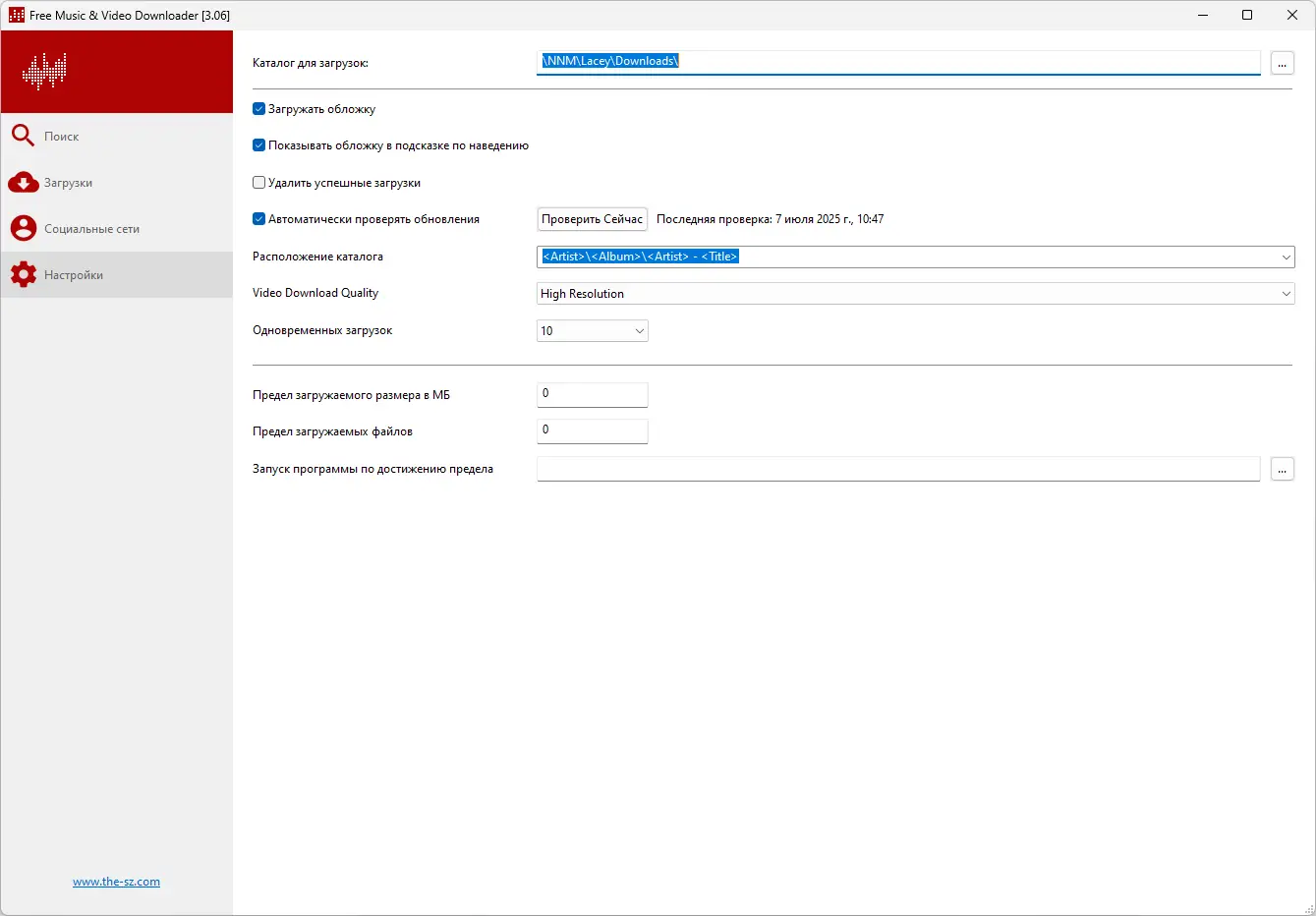 - Гибкие настройки загрузки: ограничение по размеру, количеству одновременных процессов, выбор папки
