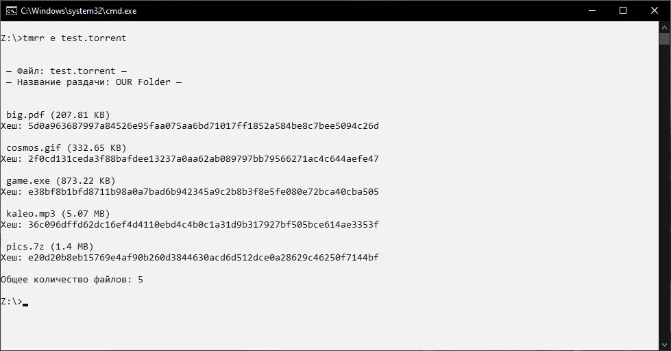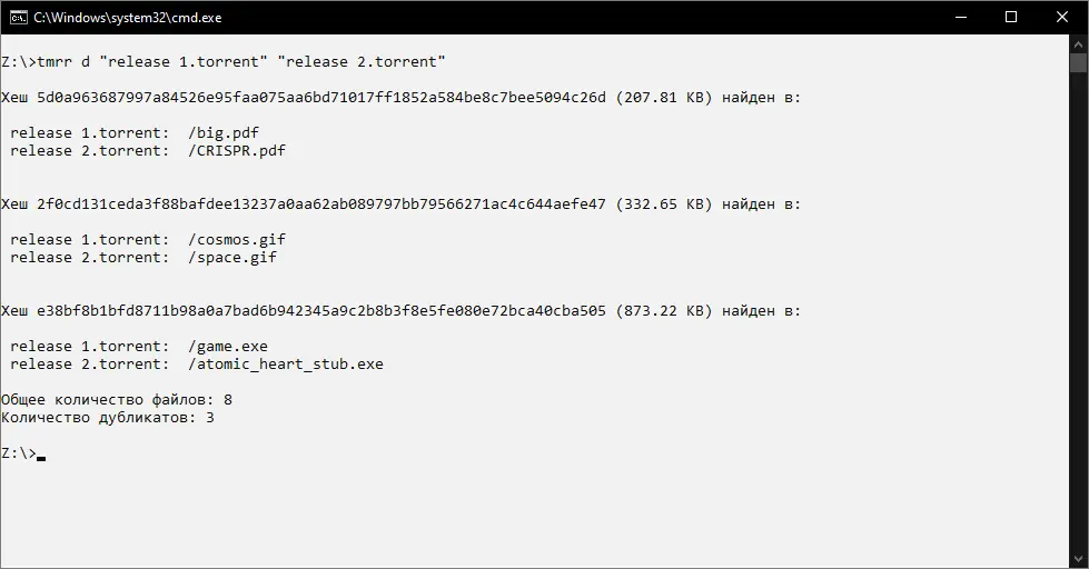 Для извлечения хешей из .torrent-файла используется команда tmrr.exe e с указанием пути к файлу. Чтобы найти дубликаты между несколькими раздачами, применяется опция d с перечислением файлов. Вычисление хеша для локального файла выполняется через команду c, после которой указывается путь к файлу. Результаты можно перенаправить в текстовый файл с помощью оператора >, что удобно для последующего анализа. Язык интерфейса меняется командой locale с параметрами ru или en.