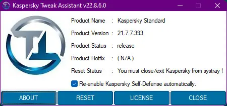 Kaspersky Tweak Assistant — утилита, предназначенная для продления триального периода продуктов компании «Лаборатория Касперского». Программа автоматически определяет установленное антивирусное ПО и позволяет сбросить оставшееся время пробного использования, восстанавливая доступ к функциям на стандартный срок. Поддерживается широкий список версий, включая актуальные релизы за 2019–2021 годы, что делает инструмент универсальным для пользователей, стремящихся временно продлить использование программного обеспечения без активации лицензии.