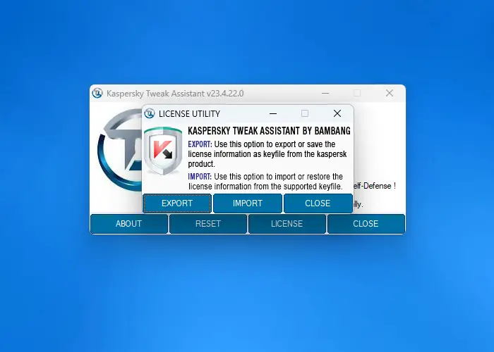 Для корректной работы с утилитой необходимо отключить самозащиту в настройках антивируса, после чего завершить его процесс через значок в системном трее. Затем следует запустить Kaspersky Tweak Assistant от имени администратора и выбрать нужное действие — сброс триала, импорт лицензии или её экспорт. При выборе опции «RESET» система автоматически перезагрузится, после чего можно активировать новую пробную версию через интерфейс антивируса. Для импорта .lic файла используется раздел «LICENSE», где доступны кнопки «IMPORT» и «EXPORT», позволяющие сохранять лицензию локально. Все действия выполняются в несколько кликов, что делает инструмент доступным даже для начинающих пользователей.