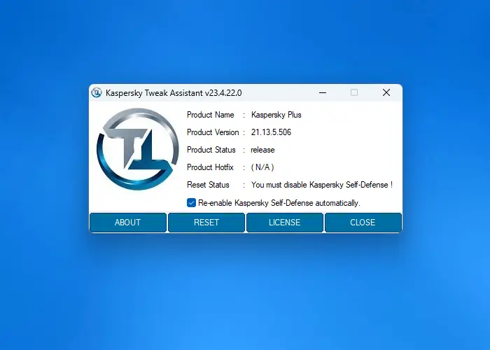 Kaspersky Tweak Assistant — утилита, предназначенная для сброса пробного периода продуктов линейки Касперского, включая антивирус, интернет-безопасность и другие решения. Инструмент автоматизирует процесс восстановления триала, обеспечивая повторное использование программного обеспечения на 30 дней без необходимости приобретения лицензии. Программа поддерживает версии, выпущенные в 2019–2021 годах, включая актуальные релизы на базе движка 21.13.5.506.
