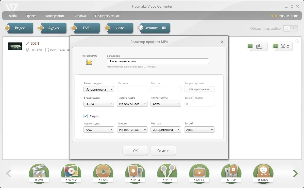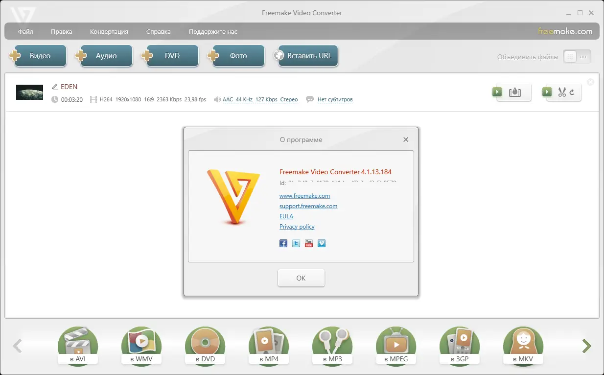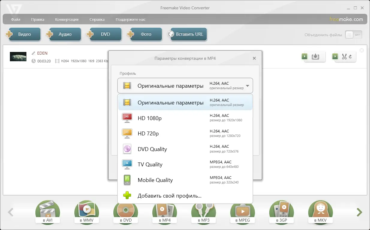 Freemake Video Converter объединяет в себе функции конвертера, видеоредактора и менеджера медиафайлов. Приложение поддерживает широкий спектр форматов, включая MP4, AVI, MKV, WMV, 3GP, FLV, MOV и другие, а также работает с аудио и DVD. Пользователи могут конвертировать видео с популярных платформ, таких как YouTube и Vimeo, сохраняя контент в высоком качестве, вплоть до Full HD и 4K. Программа также позволяет настраивать параметры кодирования, выбирать битрейт, разрешение и частоту кадров, обеспечивая гибкость при работе с медиа.
