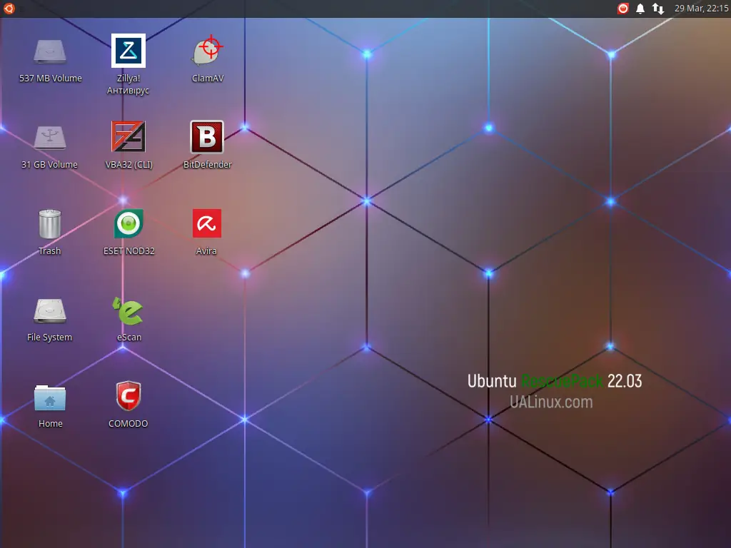 Ubuntu RescuePack представляет собой специализированный загрузочный диск, созданный на основе стабильной версии Ubuntu и оптимизированный для выполнения антивирусных операций в изолированной среде. Благодаря включению сразу восьми антивирусных сканеров — ESET, BitDefender, COMODO, eScan, ClamAV (в виде ClamTk), Vba32, Avira и Zillya! — обеспечивается высокая вероятность обнаружения даже самых скрытных угроз. Каждый из движков обновлён до актуальных версий антивирусных баз на март 2022 года, что гарантирует распознавание современных вредоносных образцов.