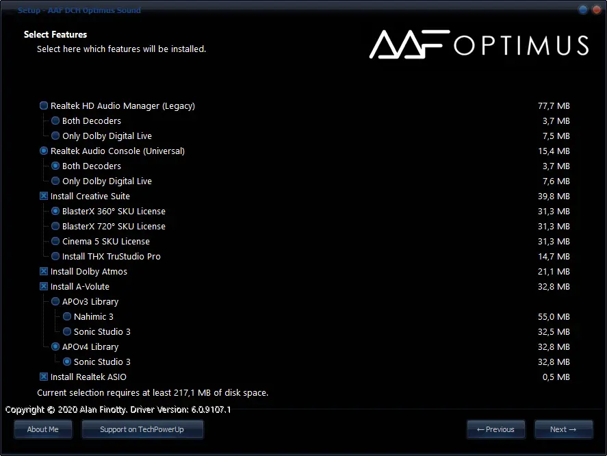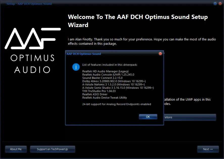 AAF DCH Optimus Sound — это модифицированный аудиодрайвер для материнских плат с чипом Realtek, объединяющий в одном пакете несколько известных аудиотехнологий. Решение позволяет улучшить звучание музыки, фильмов и игр за счёт интеграции продвинутых аудиоэффектов и утилит. Пакет поддерживает установку дополнительных компонентов, таких как Dolby Atmos, Nahimic, Sonic Studio и Sound Blaster Connect.
