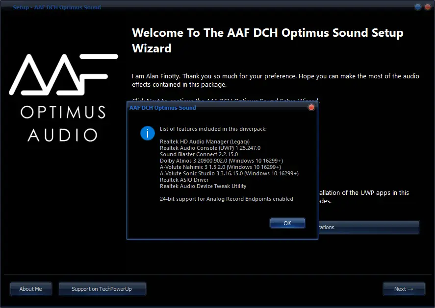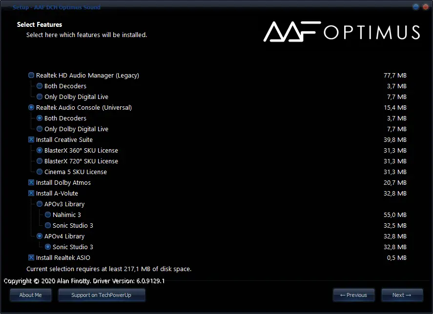 AAF DCH Optimus Sound — модифицированный аудиодрайвер для систем с чипами Realtek, объединяющий в себе несколько технологий улучшения звука. Решение поддерживает установку различных аудиооболочек, включая Realtek Audio Console, Dolby Atmos, Nahimic, Sonic Studio и Sound Blaster Connect. Программный пакет оптимизирован для максимального раскрытия потенциала встроенной аудиосистемы на материнских платах с аудиочипами Realtek.