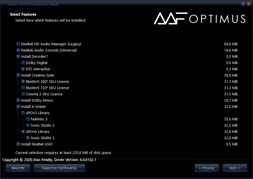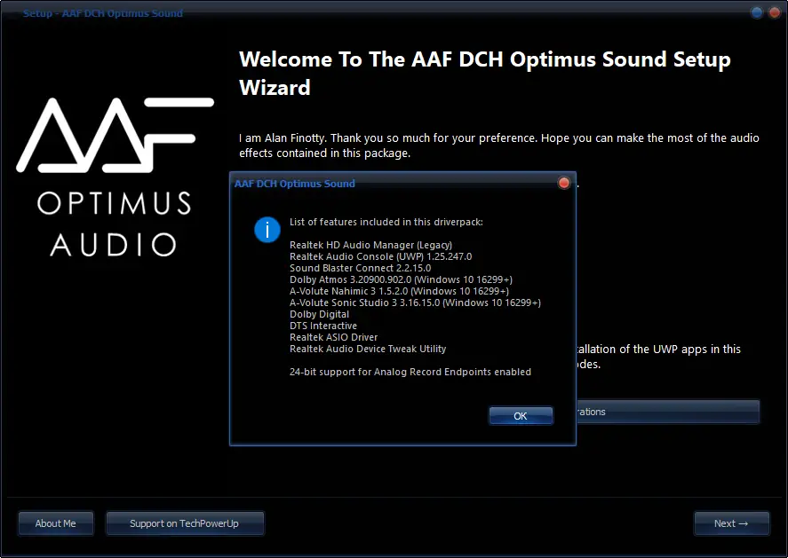 AAF DCH Optimus Sound — модифицированный аудиодрайвер для материнских плат с чипом Realtek, объединяющий в себе передовые технологии обработки звука. Программа предоставляет расширенные возможности настройки аудиосистемы, включая поддержку объемного звучания, шумоподавления и высококачественного декодирования. Установка осуществляется с выбором дополнительных компонентов для максимальной персонализации звукового сопровождения.