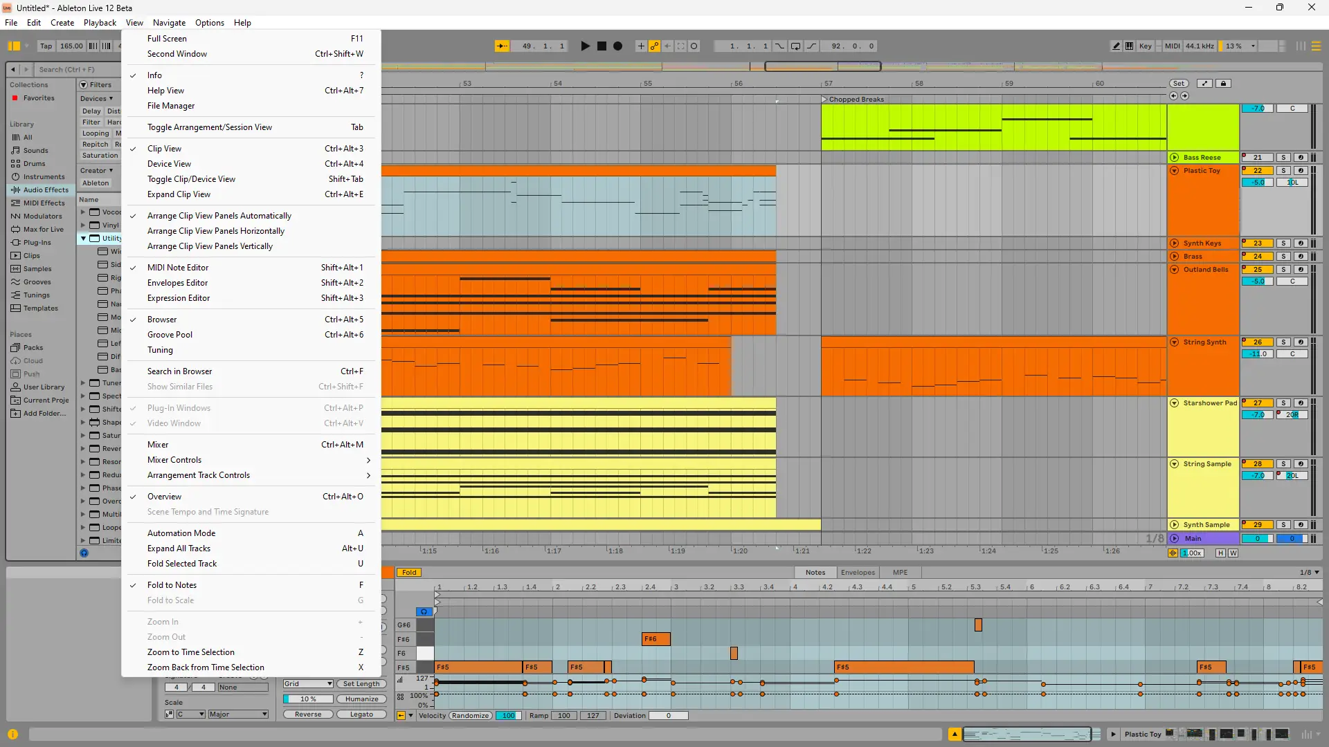 Работа с программой начинается с выбора режима: Session View для импровизации или Arrangement View для линейной записи и монтажа. Пользователь может добавлять треки, загружать сэмплы или MIDI-последовательности, а затем применять эффекты и инструменты из библиотеки. Устройства можно комбинировать, создавая сложные цепочки обработки звука, а параметры автоматизируются с помощью кривых и точек. Push интегрируется с интерфейсом, позволяя управлять клипами, микшированием и синтезом без необходимости смотреть на экран.