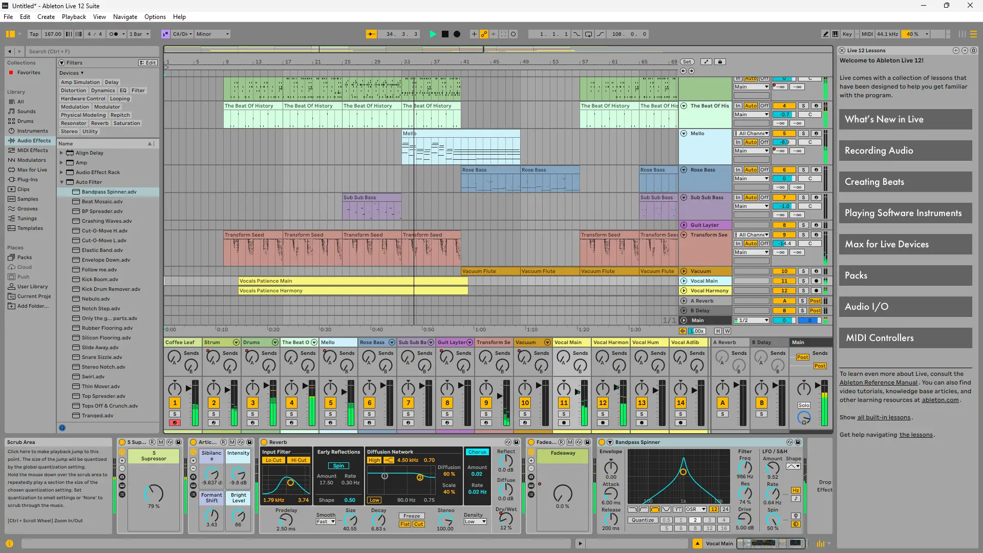Работа с Ableton основана на двух основных режимах: Session View и Arrangement View. Первый используется для импровизации и лайв-выступлений, второй — для традиционного монтажа и аранжировки. Пользователь может свободно переключаться между ними, добавляя аудио- и MIDI-треки, подключая виртуальные инструменты, накладывая эффекты и настраивая маршрутизацию. Управление упрощается при использовании контроллера Push, который интегрируется с программой на аппаратном уровне. Все изменения применяются мгновенно, без необходимости остановки воспроизведения, что особенно важно при работе с динамичными проектами.