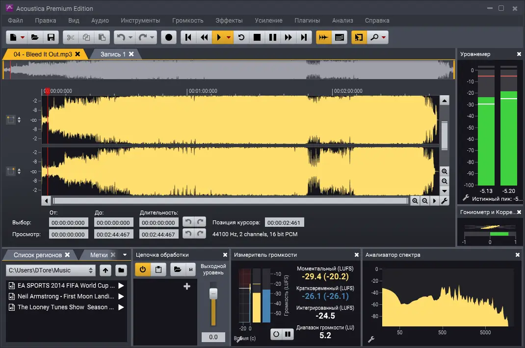 Acoustica Premium Edition — мощный аудиоредактор для записи, обработки и мастеринга звука с поддержкой многоканальных форматов до 7.1 и частотой дискретизации до 384 кГц. Программа предлагает интуитивный интерфейс, широкий набор эффектов и инструментов для реставрации, анализа и редактирования аудиофайлов. Подходит как для профессионалов, так и для любителей, работающих с audio-контентом.