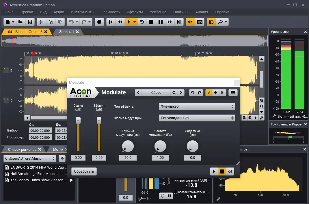 Работа с Acoustica начинается с импорта аудиофайлов через браузер медиафайлов или перетаскиванием в рабочую область. В редакторе доступны стандартные операции: вырезание, копирование, вставка, наложение дорожек и настройка кривых затухания. Спектральный редактор позволяет визуально выделять и корректировать шумы, а новые инструменты на основе глубокого обучения — автоматически удалять ветер, жужжание и шуршание с диалоговых записей. Для мастеринга используются StudioLimiter, StudioDynamics и параметрический эквалайзер. Перед экспортом можно прослушать результат в режиме реального времени, используя встроенные анализаторы для оценки баланса и фазы.