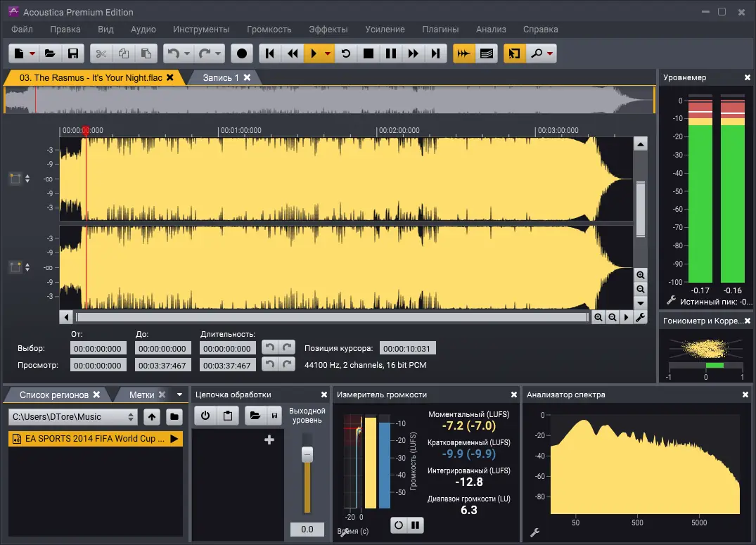 Acoustica предлагает широкий набор инструментов для профессиональной обработки звука, включая анализаторы спектра, коррелятор фаз и визуализацию уровня сигнала. Программа поддерживает работу с высоким разрешением, что особенно важно при мастеринге аудиоматериалов для профессионального выпуска. Встроенные функции реставрации позволяют восстанавливать старые записи, устраняя треск, шумы и искажения. При этом интерфейс остаётся отзывчивым даже при обработке многоканальных проектов. Однако отсутствие встроенной русской локализации может быть неудобным, хотя сторонние решения частично компенсируют этот недостаток.