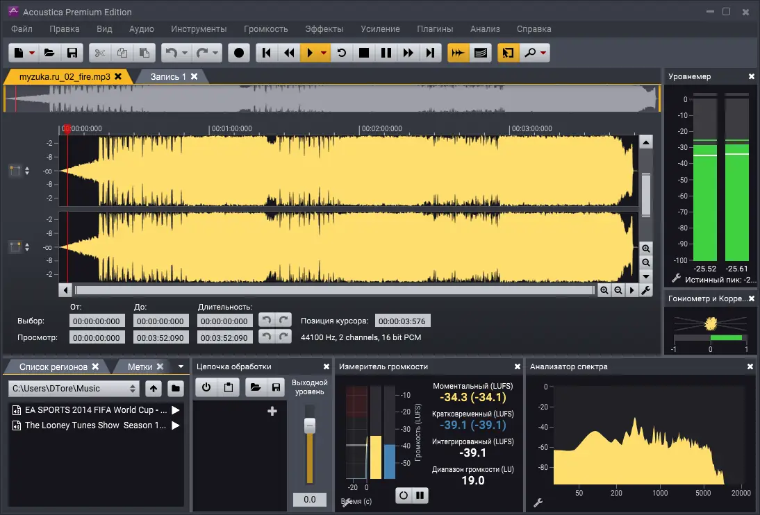 Работа с Acoustica начинается с создания нового проекта или импорта аудиофайлов. Поддерживаются как отдельные аудиозаписи, так и извлечение звука из видеофайлов форматов AVI, MPG и WMV. После загрузки материала доступны стандартные операции: вырезание, копирование, вставка и наложение дорожек. Для тонкой настройки используются кривые громкости, fade-эффекты и параметрический эквалайзер. Эффекты, такие как StudioVerb, StudioDelay и StudioPitch, можно применять в режиме реального времени с возможностью сохранения пользовательских пресетов. Для сложных задач включается Ultra Fast редактирование, позволяющее манипулировать крупными файлами без задержек. Перед финализацией проекта проводится анализ спектра, статистики и фазовой корреляции, после чего аудио можно экспортировать или сразу записать на компакт-диск.