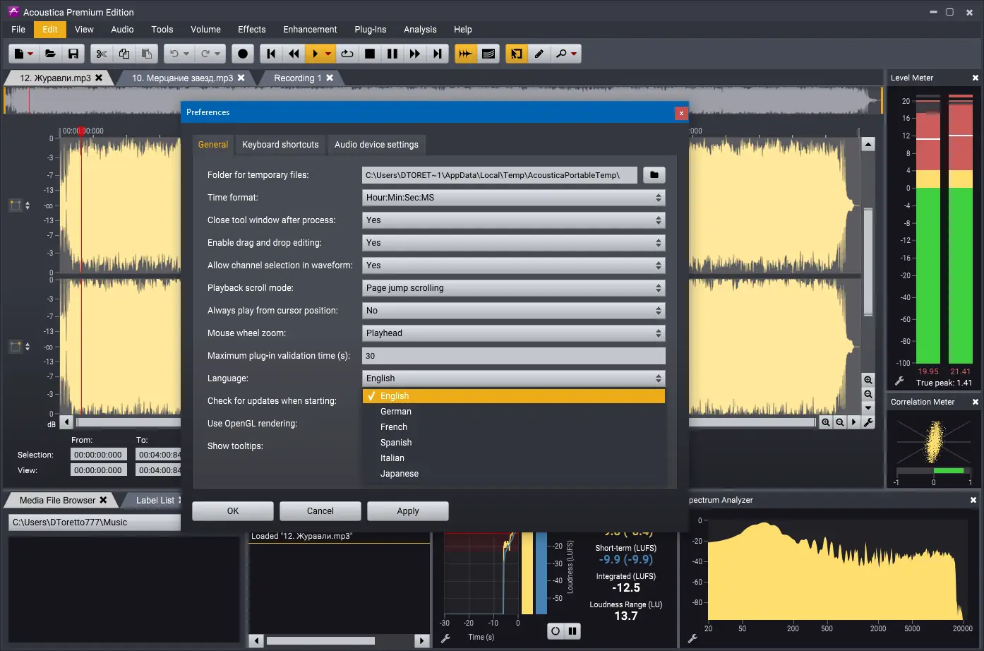 Работа с программой начинается с импорта аудиофайлов, включая поддерживаемые видеоформаты — AVI, MPG, WMV. После загрузки трека можно применять эффекты, редактировать громкость, использовать кривые fades и вносить изменения в структуру дорожки. Через менеджер эффектов доступны встроенные плагины StudioClean, StudioTime и StudioNecessities, а также поддержка сторонних VST и DirectX. Перед экспортом можно проанализировать спектрограмму, проверить фазовую корреляцию и настроить метаданные. Финальный файл можно сохранить в любом из поддерживаемых форматов или записать на компакт-диск.