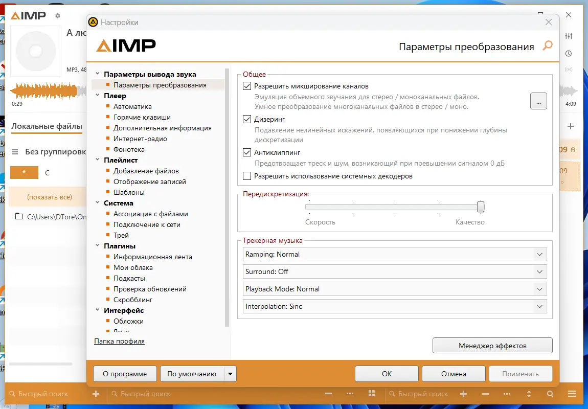 AIMP — это не просто проигрыватель, а полноценная аудиоплатформа для любителей качественного звука. Программа поддерживает огромное количество форматов, включая редкие и высококачественные, такие как FLAC, DSD, TTA, WavPack и многие другие. Благодаря 32-битной обработке аудиопотока обеспечивается максимальная точность воспроизведения, а поддержка режимов вывода через DirectSound, ASIO и WASAPI Exclusive позволяет подключать внешние ЦАП и получать звук на уровне Hi-Res. Плеер также умеет работать с CUE-файлами, что удобно при прослушивании образов дисков.