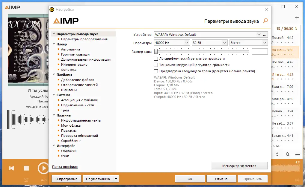- Поддержка различных режимов вывода: DirectSound, ASIO, WASAPI и эксклюзивный WASAPI — даёт возможность подключить профессиональное оборудование.