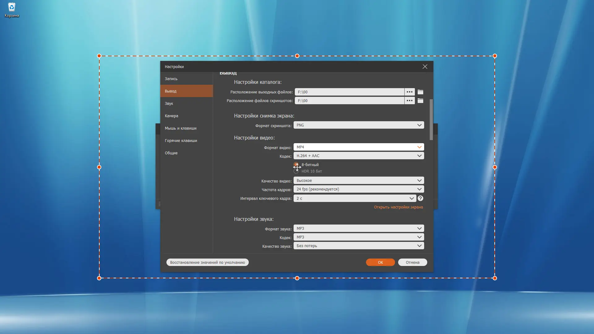 - Гибкие настройки вывода: выбор кодека, частоты кадров, битрейта аудио и видео