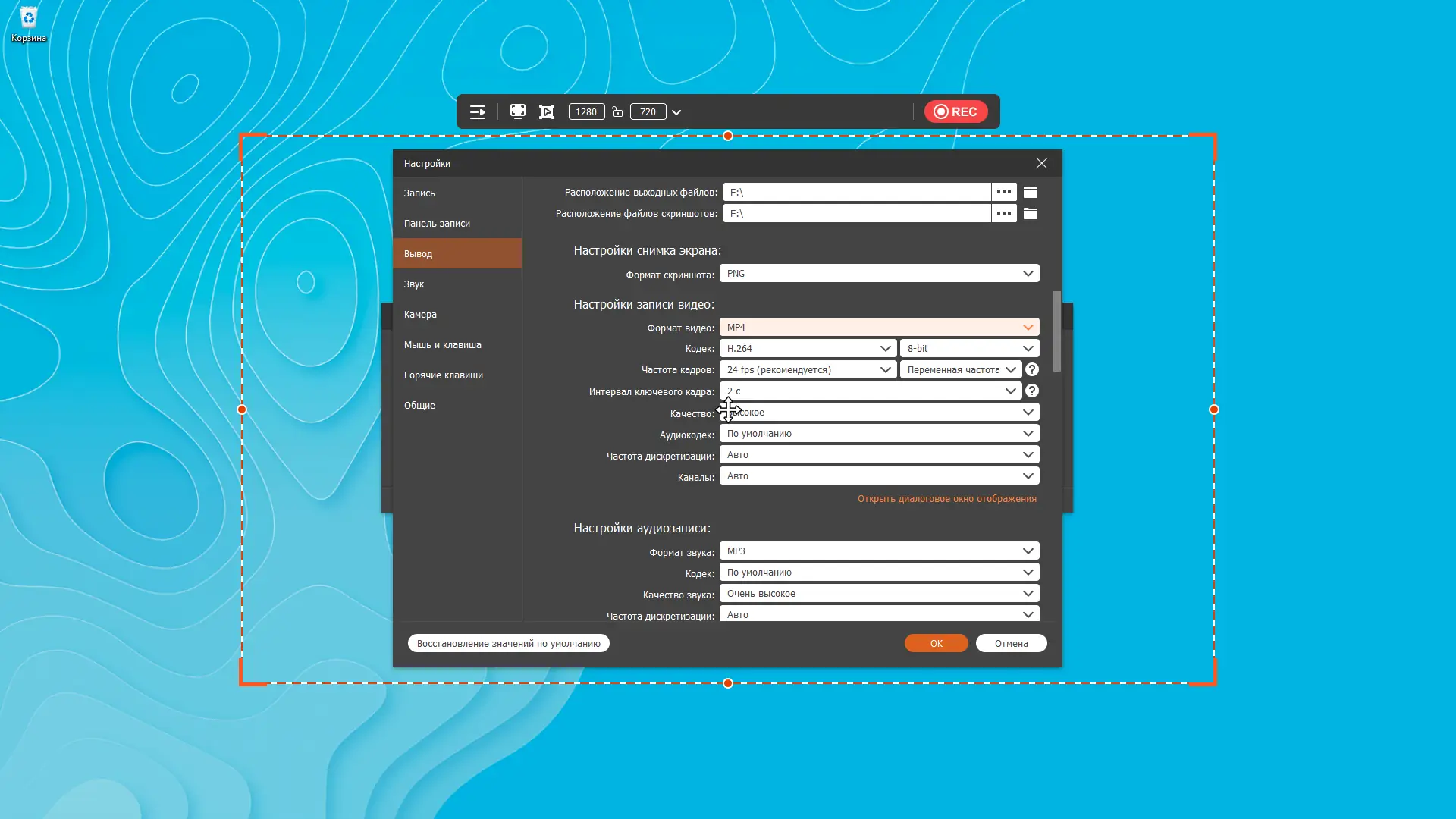 - Гибкие настройки вывода: видеокодек, битрейт, частота кадров, качество аудио.