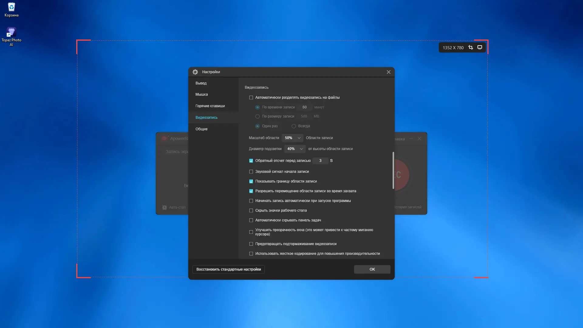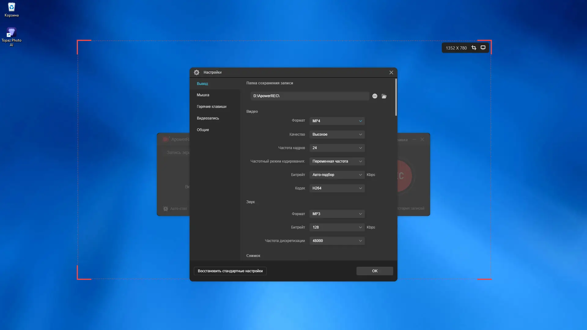 - Возможность настройки источников звука: системный аудио, микрофон или оба одновременно