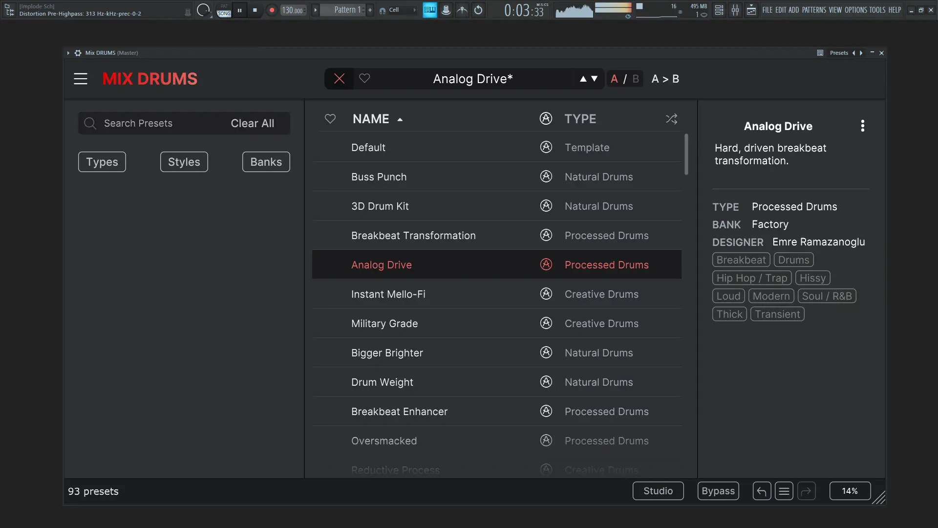 Arturia — Mix DRUMS представляет собой комплексный процессор, ориентированный на максимальное усиление воздействия ударных в миксе. Благодаря технологии параллельной обработки и продуманной архитектуре, плагин сохраняет пиковые уровни сигнала, одновременно повышая воспринимаемую громкость. Это достигается за счёт комбинации динамической обработки, искажений, фильтрации и пространственных эффектов, объединённых в единую систему.
