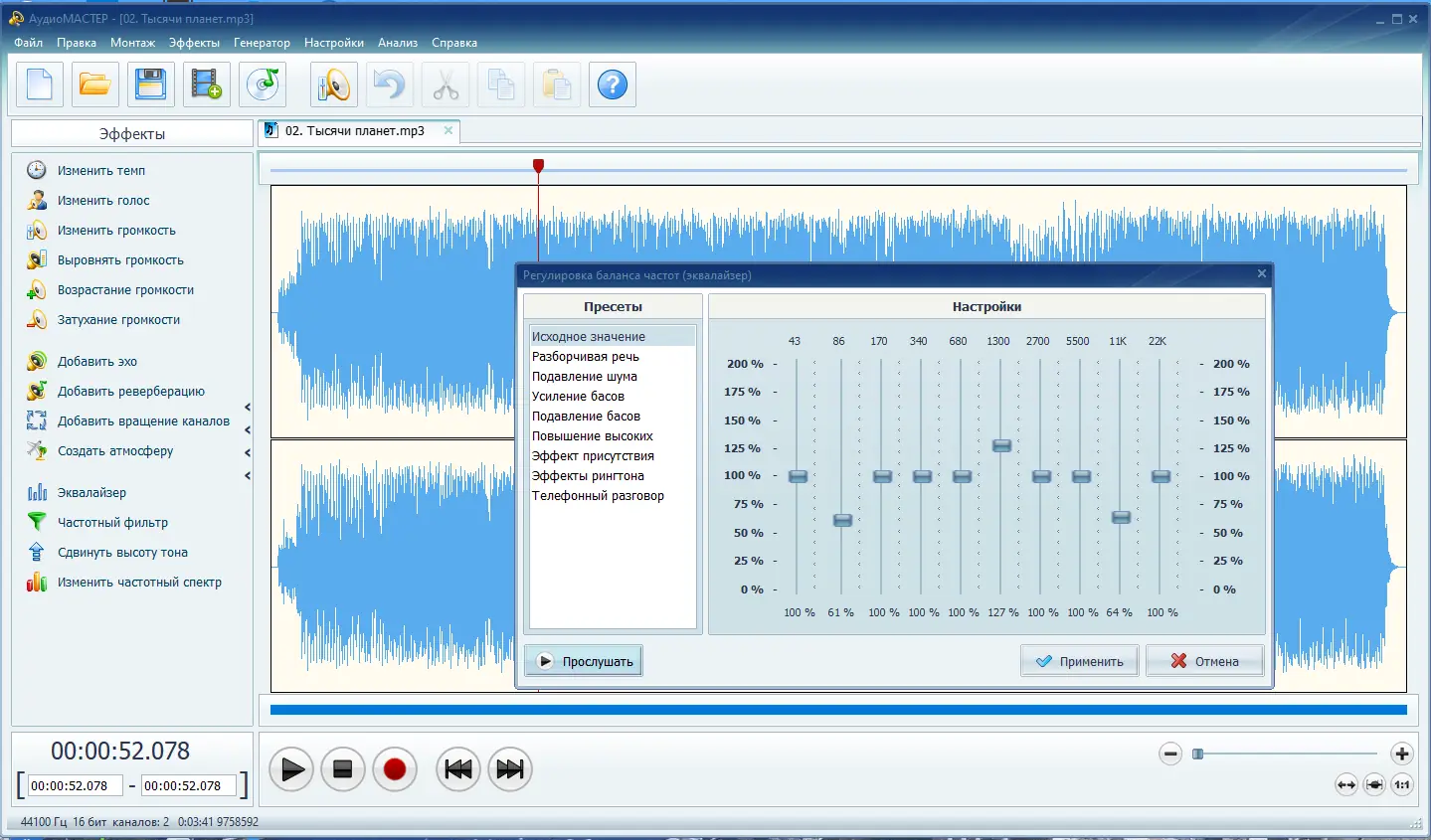 АудиоМАСТЕР представляет собой универсальное решение для работы с аудио на персональном компьютере. Утилита поддерживает широкий спектр операций: от базовой обрезки и соединения файлов до применения сложных звуковых эффектов. Благодаря продуманной архитектуре, редактор справляется с задачами в реальном времени, не перегружая систему. Это делает его удобным инструментом для повседневного использования.
